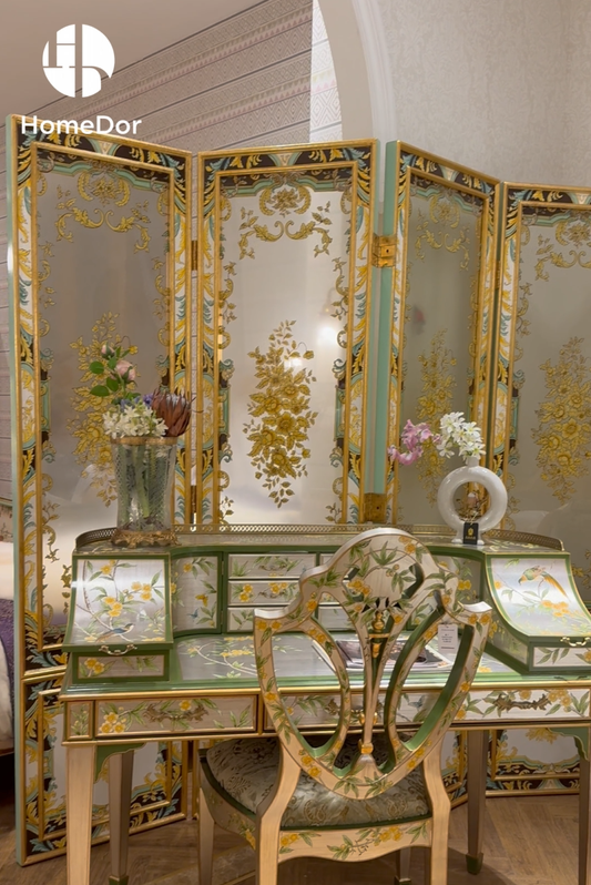 HomeDor Luxury Rococo Hand-Painted Floral Dressing Table with Ornate Mirror