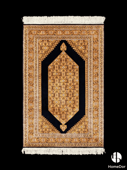سجادة كشميرية يدوية الصنع من حرير التوت الأسود والذهبي بميدالية هندسية 60 سم × 90 سم