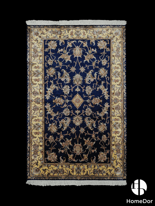 سجادة كشميرية مصنوعة يدويًا من حرير التوت الأزرق الداكن، مقاس 118 سم × 187 سم