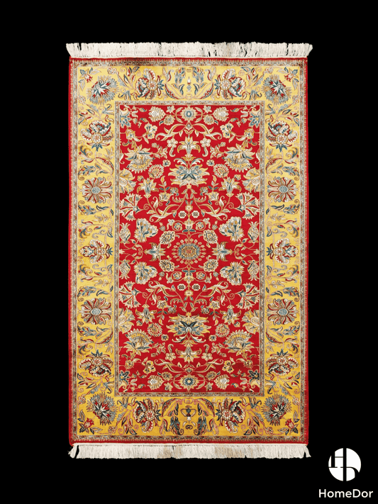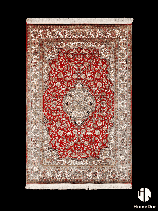 سجادة كشميرية حمراء مصنوعة يدويًا من حرير التوت 123 سم × 185 سم
