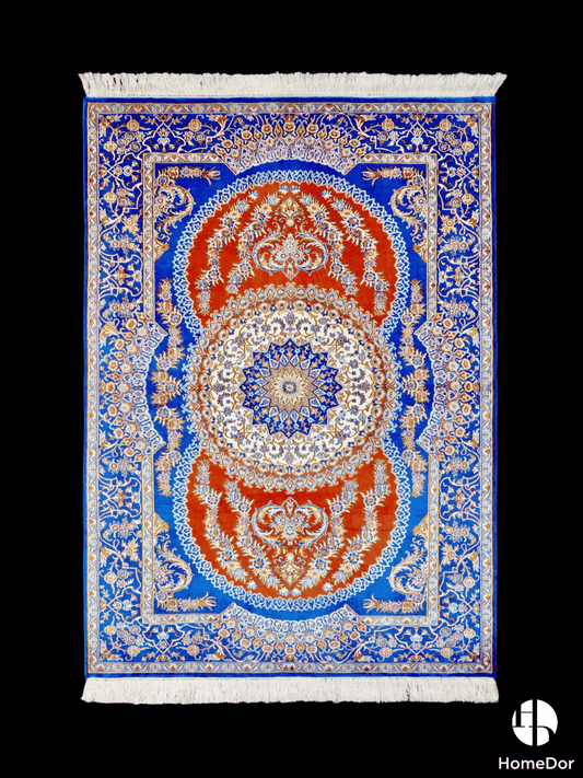 سجادة كشميرية يدوية الصنع من حرير التوت الأزرق والبرتقالي بميدالية 129 سم × 185 سم