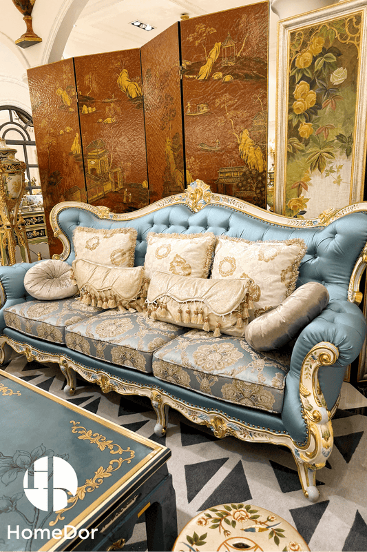 HomeDor × FH&Home | أريكة فاخرة منحوتة ملكية بنمط باروكي أزرق سيمفوني