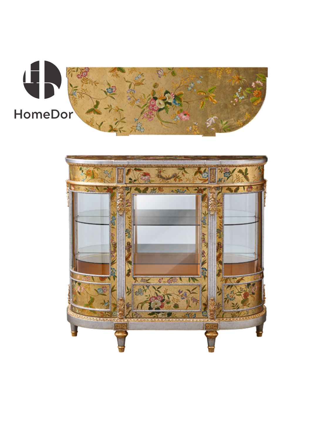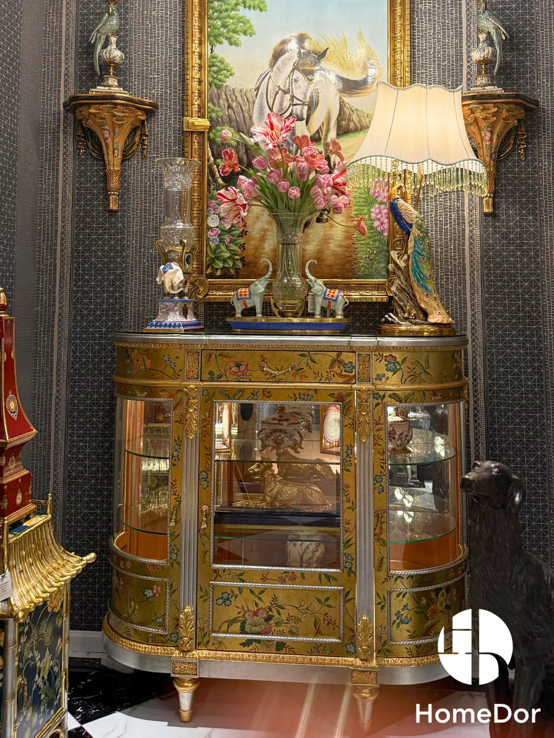 خزانة عرض هوم دور تشينوازري السوداء والمذهبة ذات الملمس المتشقق هي مزيجٌ رائع بين جماليات الشرق وتصميم الفخامة الأوروبية. يتميز لونها الأسود الجذاب بملمس متشقق مميز، مزين برسومات يدوية مذهبة لمناظر طبيعية خلابة من المعابد والأشجار والطيور، تستحضر سحر فن الشينوازري الكلاسيكي. توفر الأقسام الزجاجية المنحنية مساحة عرض أنيقة وآمنة لمقتنياتك الثمينة، بينما يوفر الدرج العلوي مساحة تخزين سرية للأغراض الصغيرة. تُعد هذه الخزانة نقطة جذب مميزة في غرف الطعام الرسمية أو غرف المعيشة أو المداخل الفاخرة، حيث تضفي على أي مكان فخامةً عابرة للثقافات وجاذبية فنية خالدة.
