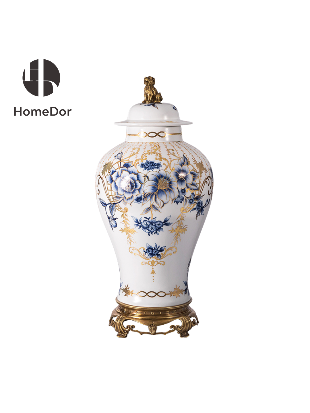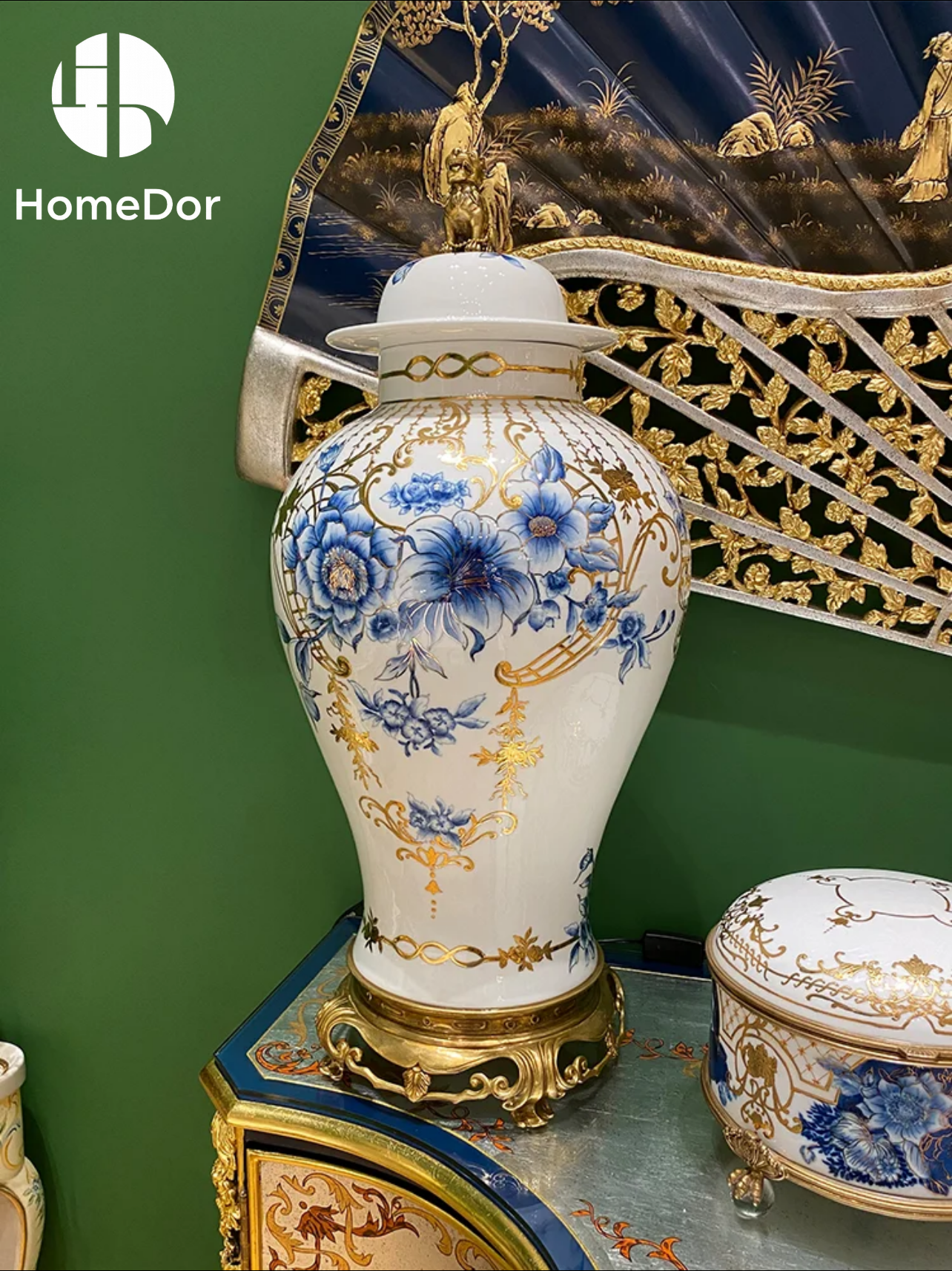 تجمع هذه المجموعة الديكورية بين سحر الفن الصيني الخالد وتفاصيل التذهيب الفاخرة: تتميز بنقوش زهور الفاوانيا الزرقاء والبيضاء الرقيقة (رمز الرخاء في الثقافة الصينية) المقترنة بلمسات ذهبية مزخرفة، حيث تمزج كل قطعة (من علبة الحلي إلى المزهرية) بين فن الخزف الكلاسيكي والحرفية المعدنية الملكية. مثالية لتزيين طاولات الطعام أو طاولات المدخل أو أرفف غرفة المعيشة، فهي تضفي على المساحات أناقة تجمع بين الشرق والغرب - مثالية لرفع مستوى الديكور اليومي أو إضافة لمسة فاخرة إلى التجمعات الخاصة.