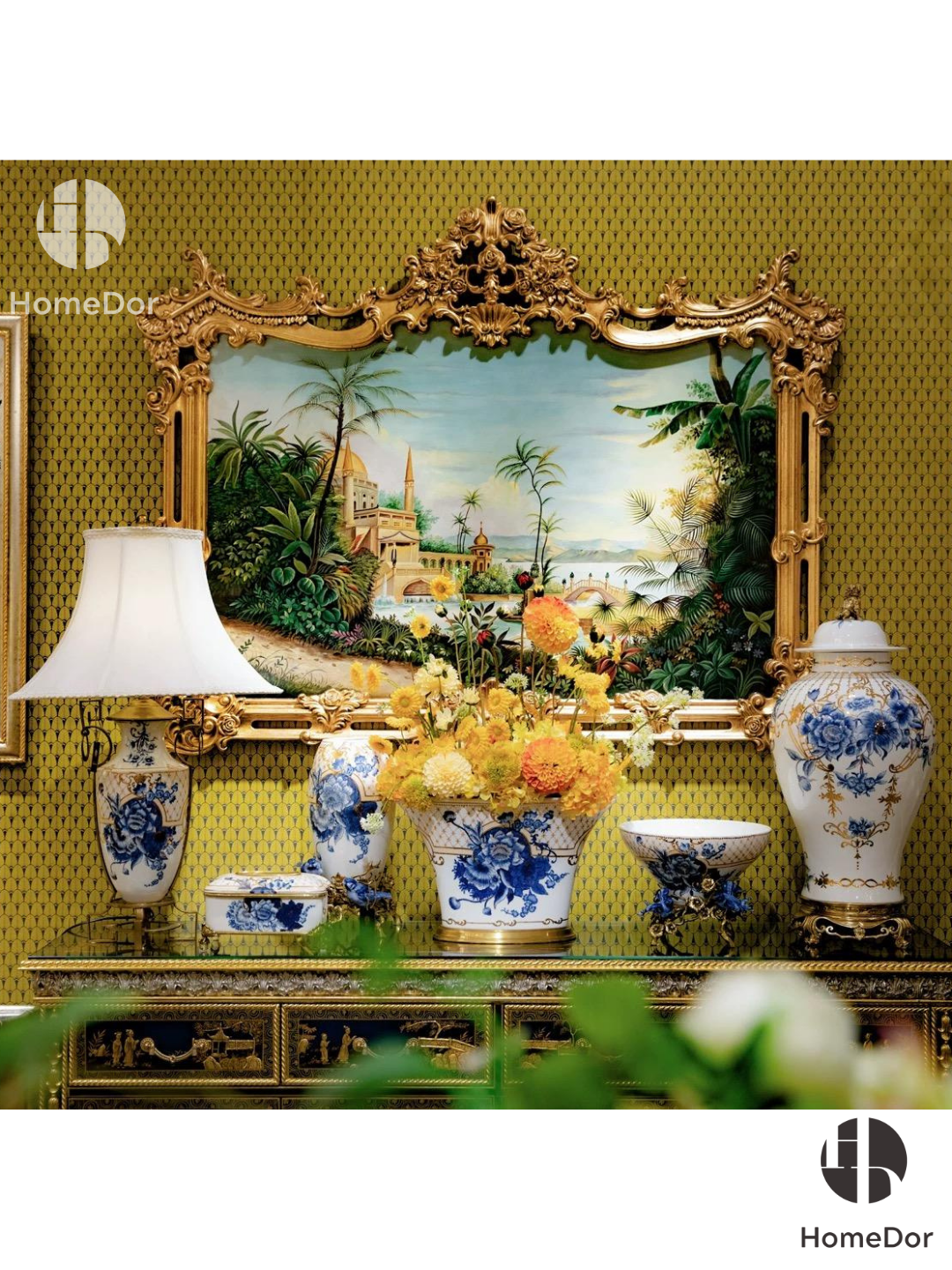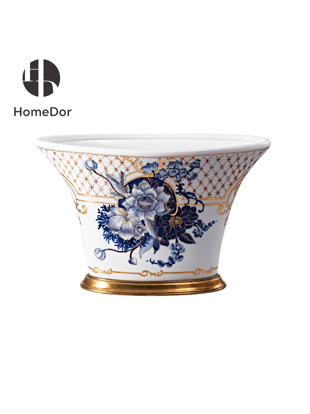 طقم ديكور هوم دور الصيني المذهب باللونين الأزرق والأبيض بزهرة الفاوانيا II
