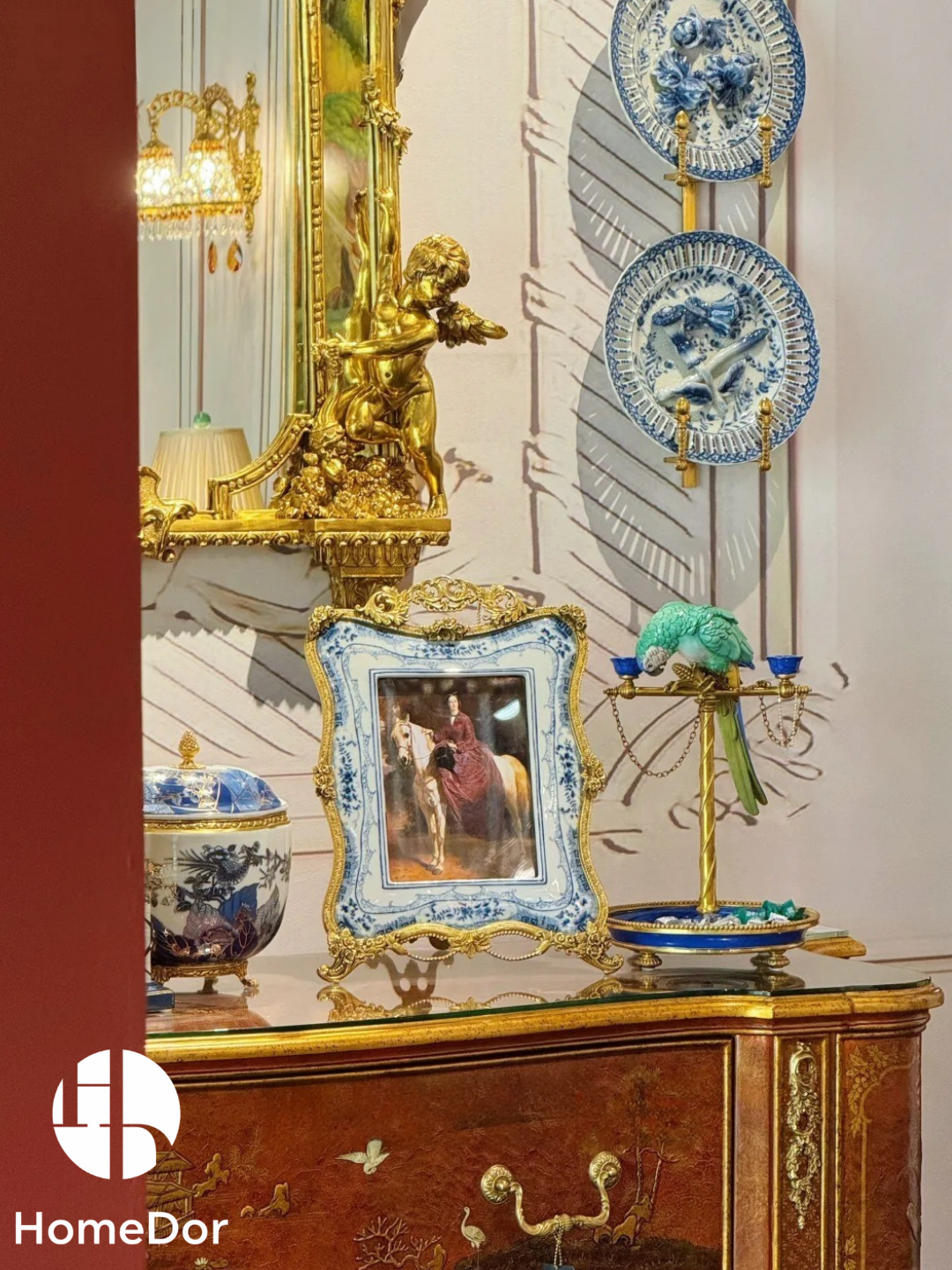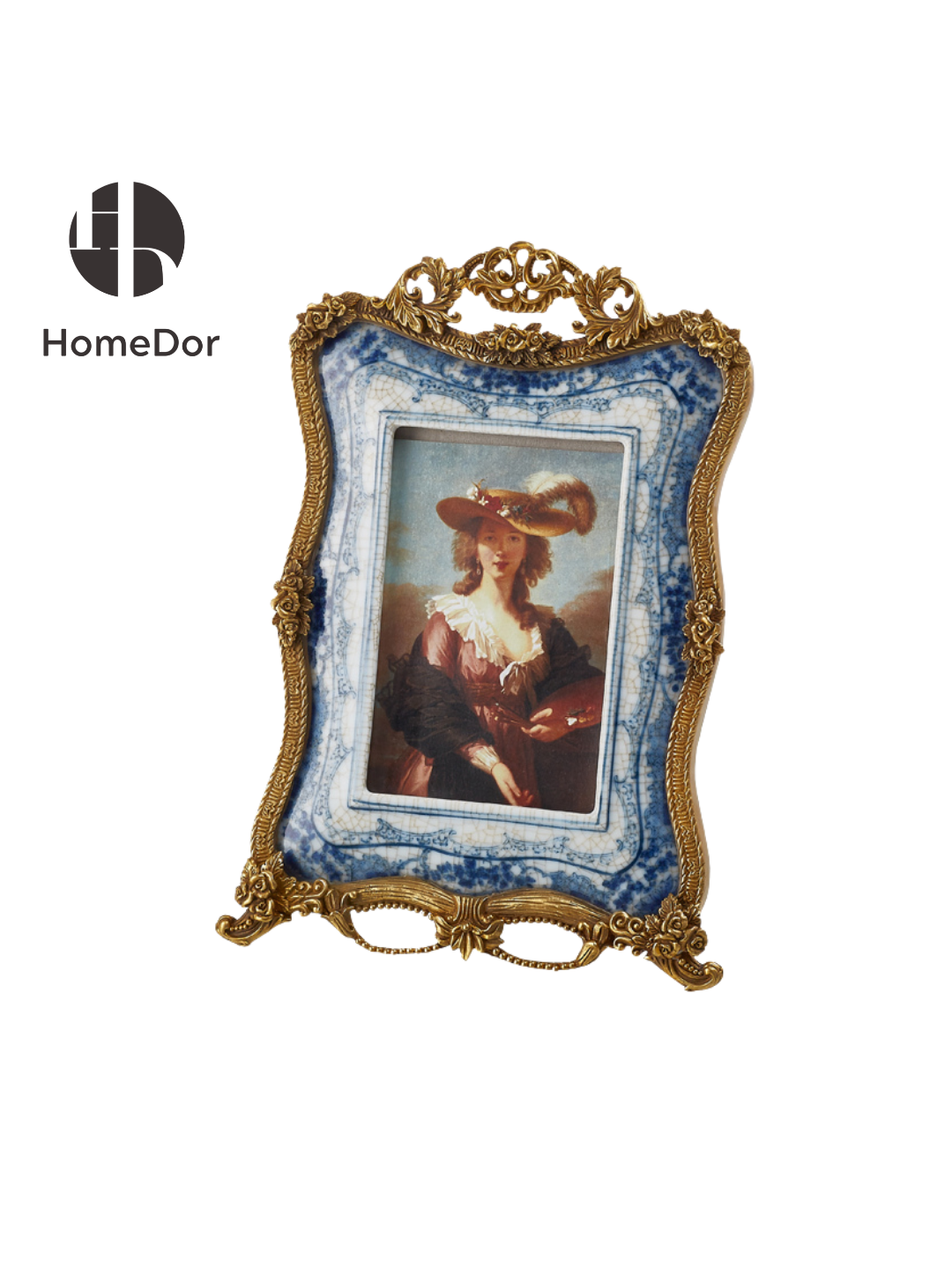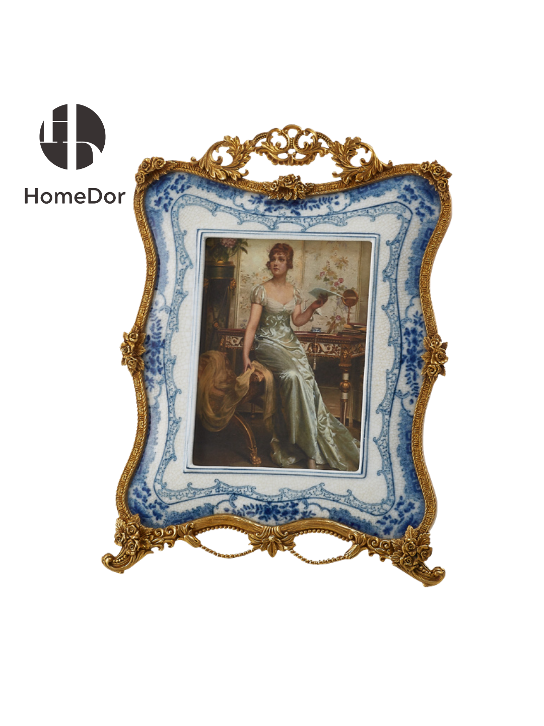 إطار الصور الرائع هذا من هوم دور هو مزيج متناغم بين براعة صناعة الخزف الصيني التقليدي باللونين الأزرق والأبيض وأناقة الروكوكو الأوروبية. تتميز لوحة الخزف بزخارف زهرية زرقاء دقيقة مرسومة يدويًا على طبقة زجاجية متشققة، ومؤطرة بإطار معدني مذهب مزخرف بنقوش نباتية وزخارف لولبية متقنة. شكله الأنيق المنحني وقاعدته المزخرفة يجعلان منه إضافة رائعة لعرض الذكريات العزيزة. مثالي لطاولات الزينة أو رفوف المدافئ أو الطاولات الجانبية، فهو يضفي على أي مكان لمسة من الرقي الخالد الذي يجمع بين ثقافات مختلفة.