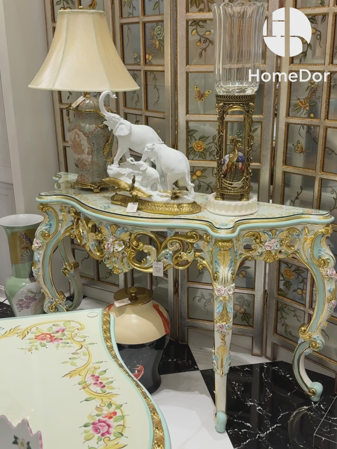 تجسد طاولة الكونسول الرائعة هذه أناقة تصميم الروكوكو الفرنسي الساحر، بسطحها العاجي المزين بنقوش زهرية دقيقة مرسومة يدويًا وزخارف ذهبية متقنة. أما أرجلها المنحنية، فهي منحوتة بسخاء على شكل عناقيد زهرية ثلاثية الأبعاد، تتخللها لمسات زرقاء فاتحة ناعمة وتفاصيل ذهبية لامعة، مما يضفي عليها إحساسًا بالحركة والرومانسية. صُممت هذه الطاولة لتكون نقطة جذب مميزة، فهي تُضفي سحرًا خالدًا على المداخل وغرف المعيشة وغرف الطعام، وهي مثالية لعرض المزهريات والتحف الفنية ومصابيح الطاولة. يمزج لونها العاجي اللامع وألوان الباستيل الناعمة والحرفية الدقيقة بين الطرازات التقليدية والكلاسيكية الجديدة والفاخرة، ليمنحها سحرًا حالمًا يُذكرنا ببيوت الريف الفرنسية في القرن الثامن عشر.