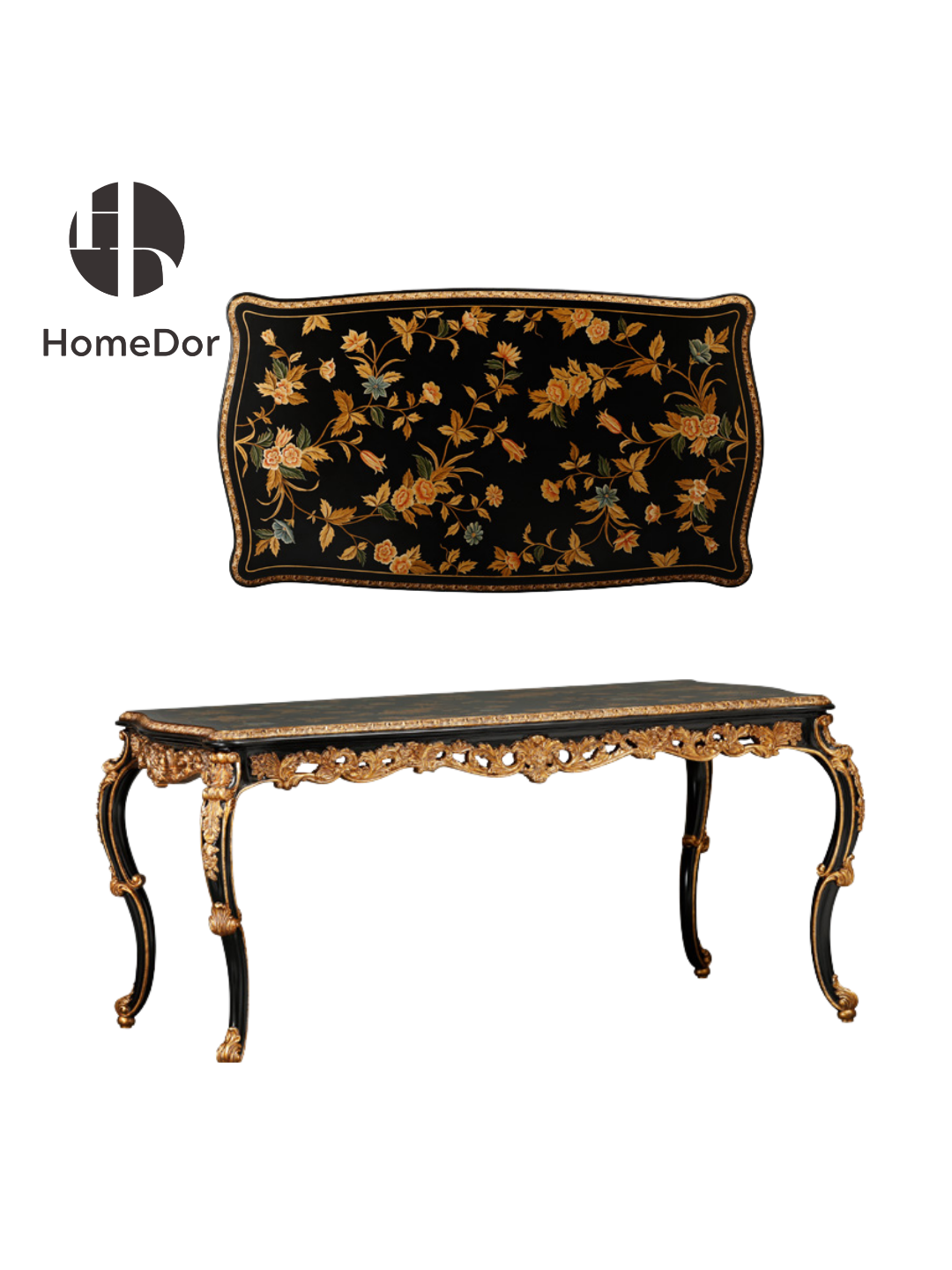 This exquisitely crafted dining set masterfully fuses European regal elegance with the delicate poetry of spring blooms. Framed in striking obsidian black wood, it is adorned with intricate hand-painted gilded floral motifs that unfurl like a vibrant spring garden across the table’s apron, legs and the chair’s oval backrest—each detail glimmers with luminous gold against the deep noir backdrop for a stunning contrast.