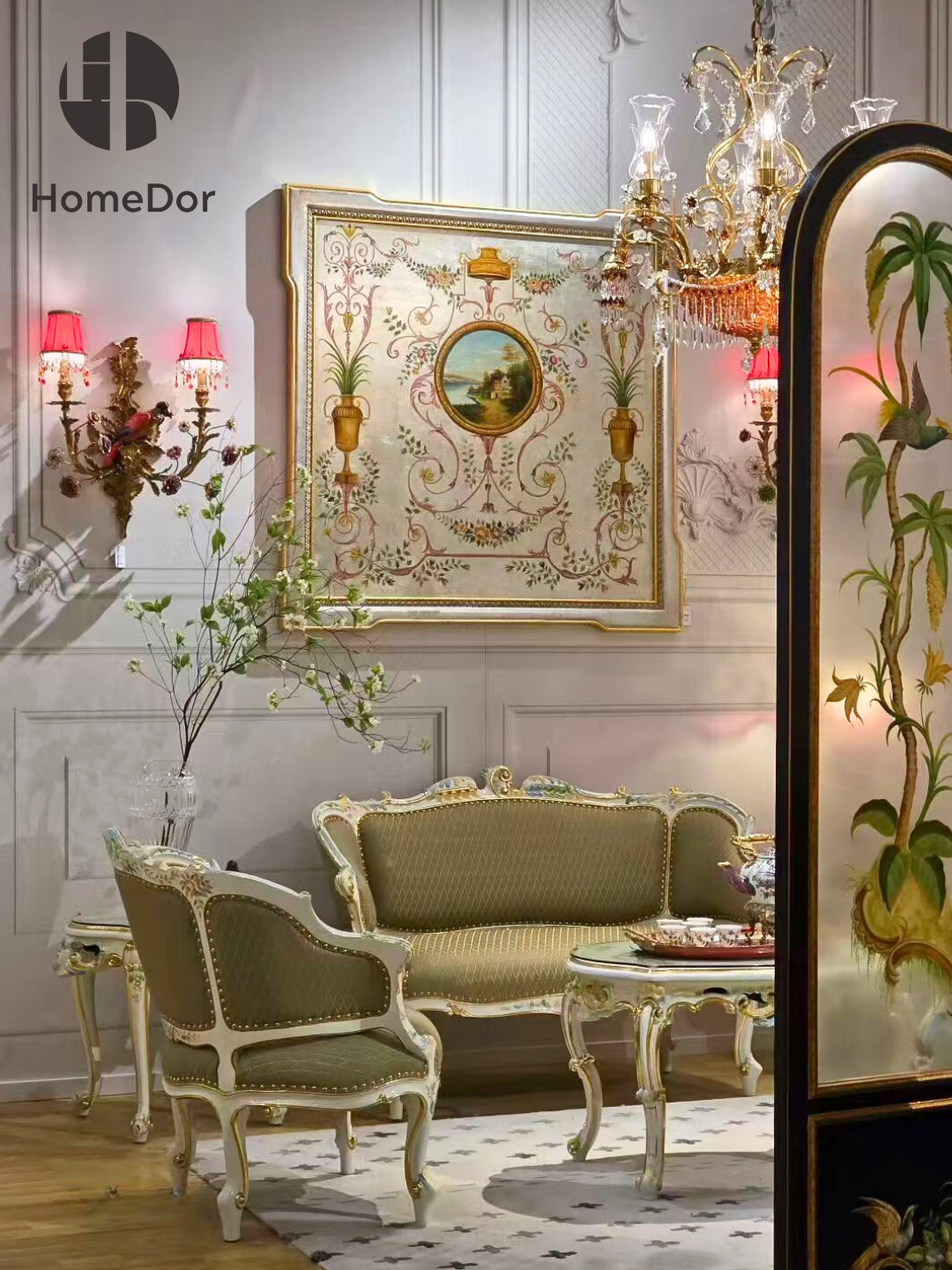 من مجموعة ديكور آند جيفتس، تُشع هذه القطعة الفنية الجدارية الكلاسيكية الرائعة، المرسومة يدويًا بنقوش نباتية دقيقة وحواف نحاسية، برقيٍّ خالد. فهي تُجسّد مزيجًا متقنًا من الجماليات الأوروبية الكلاسيكية والحرفية الدقيقة. وتعكس النقوش النباتية الغنية المرسومة يدويًا والزخارف النحاسية العتيقة ذوقًا رفيعًا في الديكور الداخلي التقليدي.