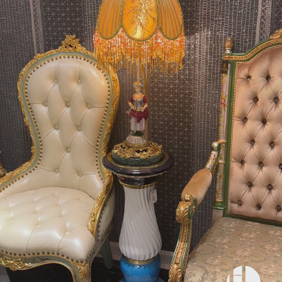 سيمفونية من عظمة الباروك ودقة الفن، يُعيد مصباح الطاولة هذا تعريف الفخامة من خلال مزيج FH&Home المميز من النحاس والسيراميك والرخام. صُنع هذا المصباح بمهارة على يد حرفيين ماهرين، ويُجسد روعة البلاط الأوروبي في القرن الثامن عشر، حيث يُجسد تمثالاً أنثوياً منحوتاً بزي روكوكو مزخرف، يقف فوق منصة رخامية مذهبة ذات قاعدة خضراء زمردية. في الأعلى، يدعم ساق رفيع من الذهب الأصفر غطاء مصباح مقبب مزين بتطريز ذهبي وشرابات متدفقة من الخرز الذهبي والوردي، ليُلقي ضوءاً أثيرياً يمزج بين الهيبة الملكية والأناقة الأنثوية.