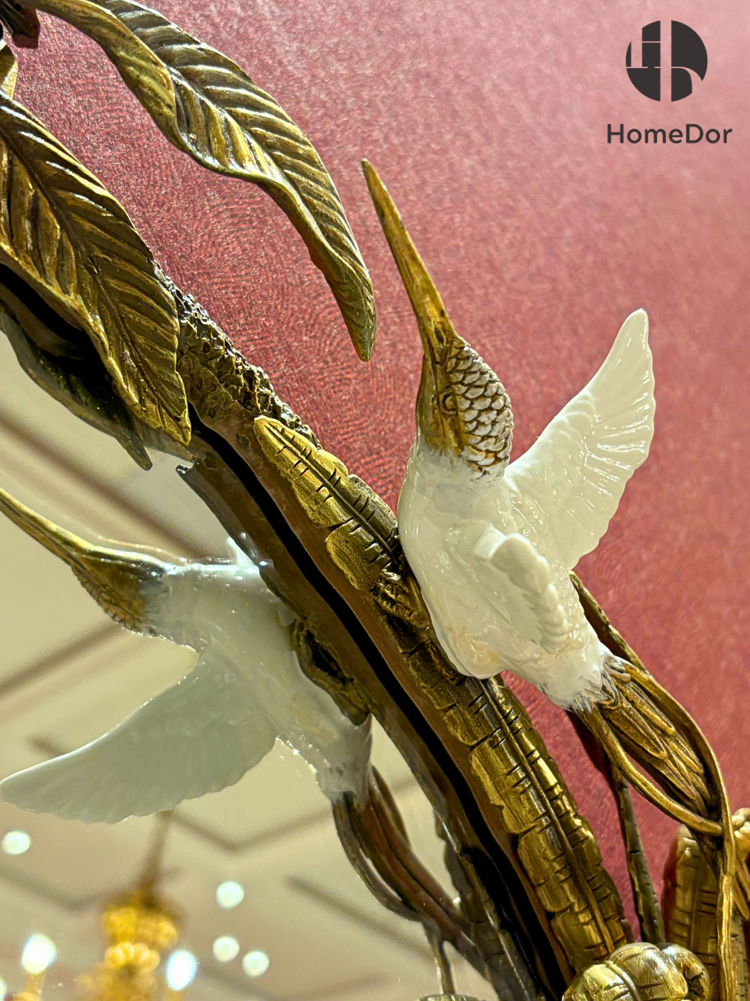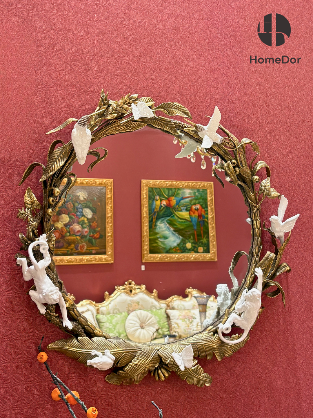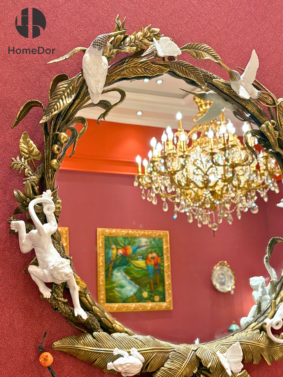 حوّل مساحتك إلى ملاذ استوائي مع المرآة الدائرية المستوحاة من شجرة الموز. تتميز هذه القطعة الرائعة بمرآة عالية الوضوح في مركزها، محاطة بإطار خلاب مزين بنقوش أشجار الموز الوارفة وأوراق منحوتة يدويًا. تضفي الزخارف الرقيقة المستوحاة من الحياة البرية، مثل الطيور الصغيرة والقرود المرحة وظلال الفراشات، مزيدًا من السحر عليها. بفضل لونها البرونزي العتيق الدافئ، لا تُعد هذه المرآة عملية فحسب، بل هي أيضًا محط أنظار الجميع، إذ تُضفي حيوية الغابة الاستوائية على أي غرفة. مثالية للحمام أو غرفة المعيشة أو المدخل، فهي تُضفي لمسة من السحر والجمال الطبيعي على ديكورك.