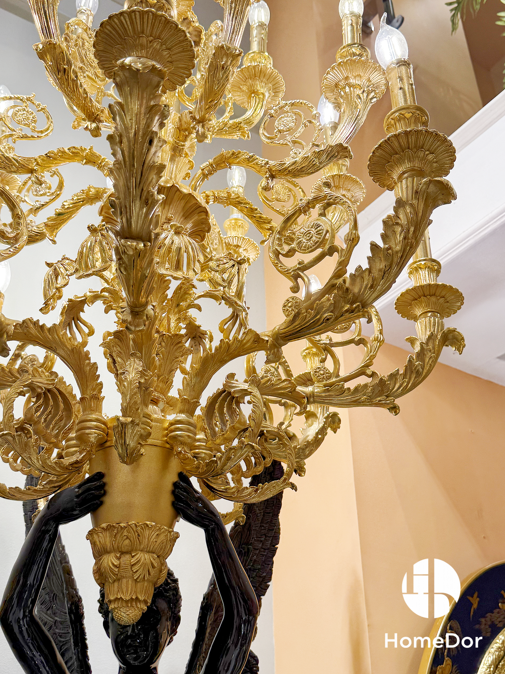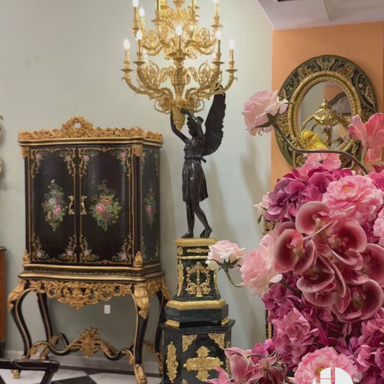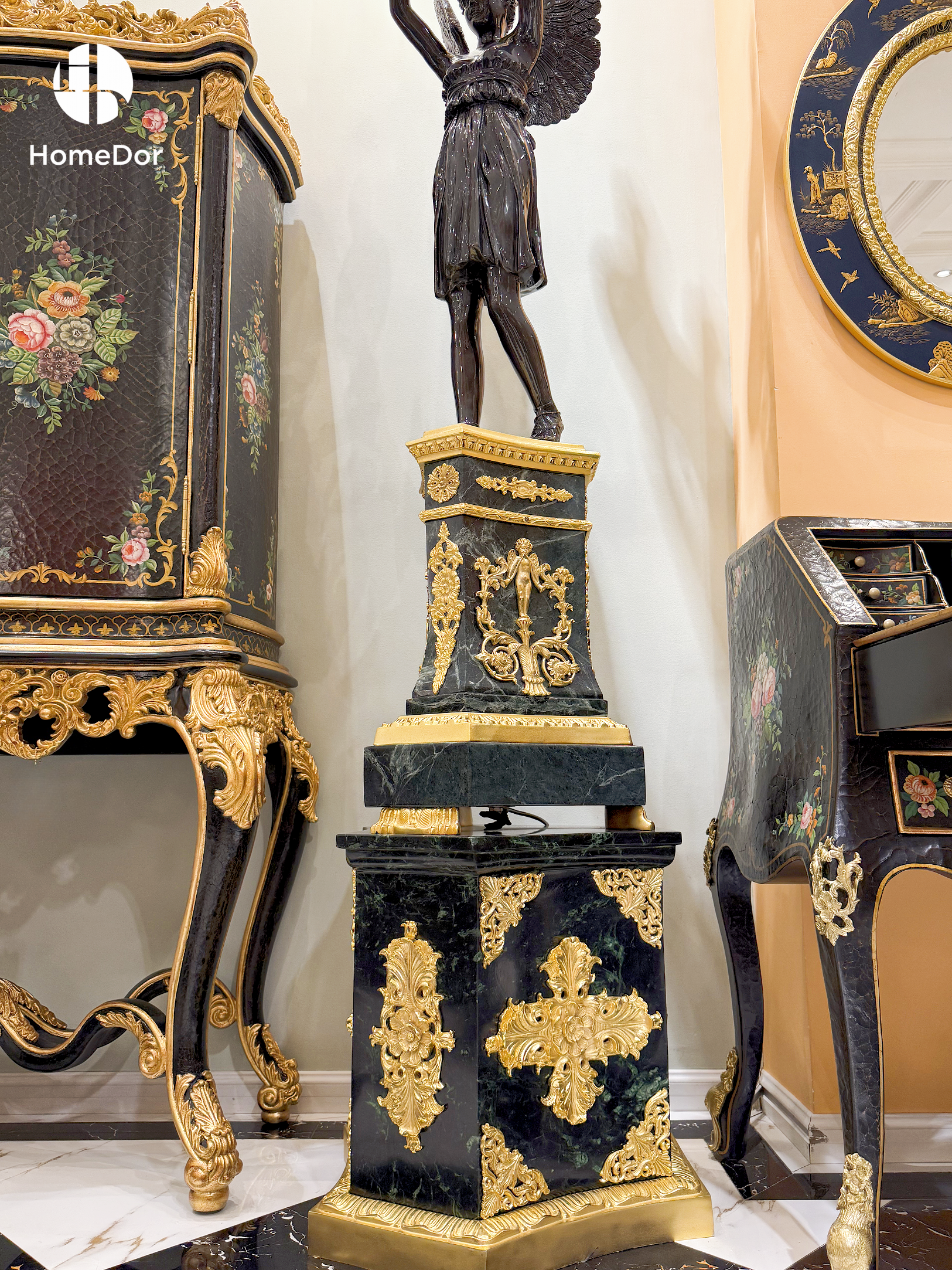 يُعيد مصباح الأرضية الرخامي "الملاك الحارس" تعريف الفخامة من خلال مزيج بارع من روحانية الباروك وحرفية عصر النهضة. صُممت هذه القطعة وصنعتها شركة FH&Home، وتتميز بتمثال ملاك رخامي (ارتفاع 300 سم) بأجنحة ممدودة وأذرع مرفوعة تحمل شمعدانًا ذهبيًا متدرجًا - أذرعه المصنوعة من النحاس الأصفر المطلي بالذهب عيار 24 قيراطًا تُجسّد الطقوس المقدسة والعظمة الإمبراطورية.