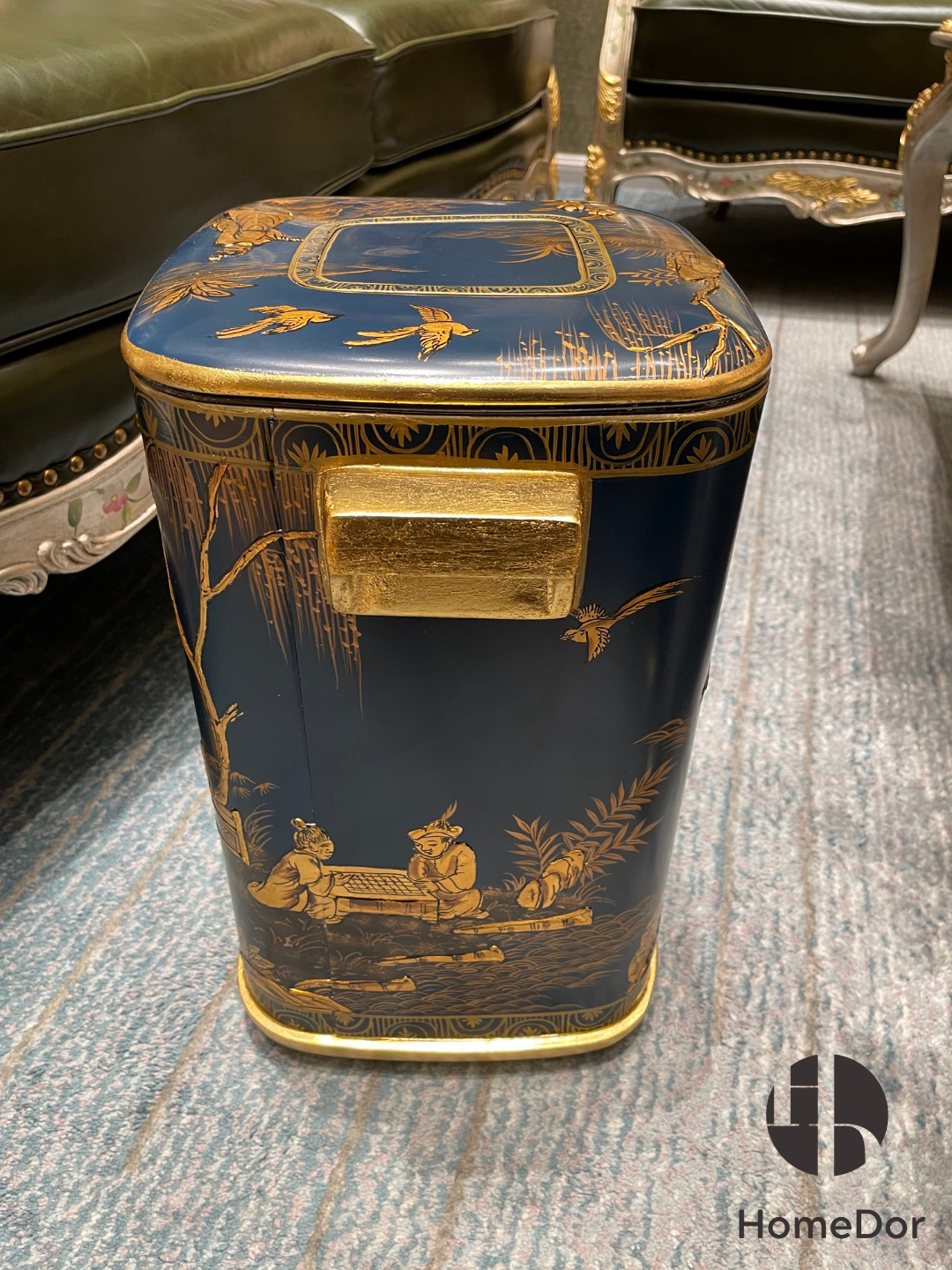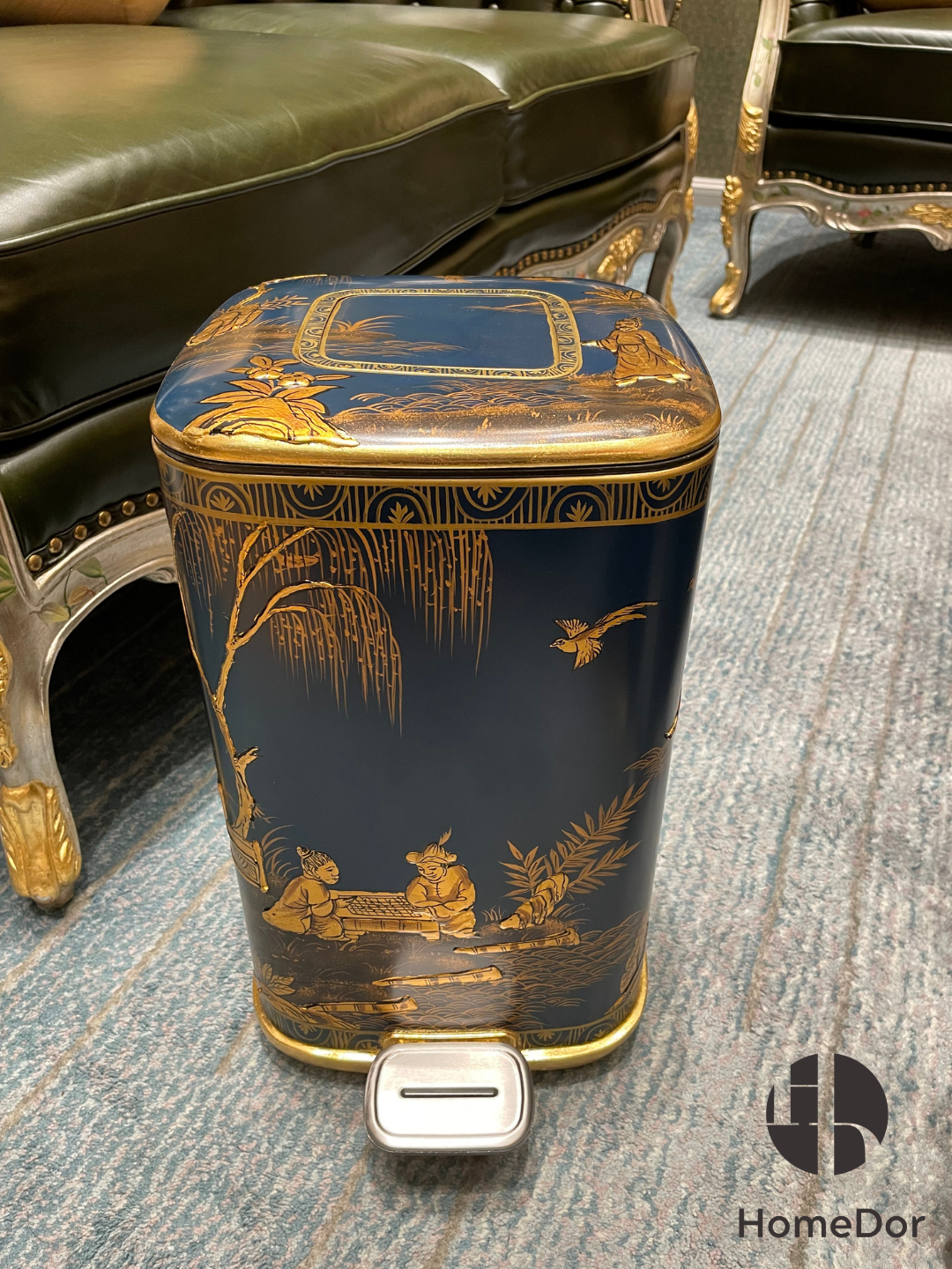 سلة مهملات مطلية بالذهب من سلسلة هوم دور رويال بلو، مزينة برسومات صينية وزخارف طبيعية.