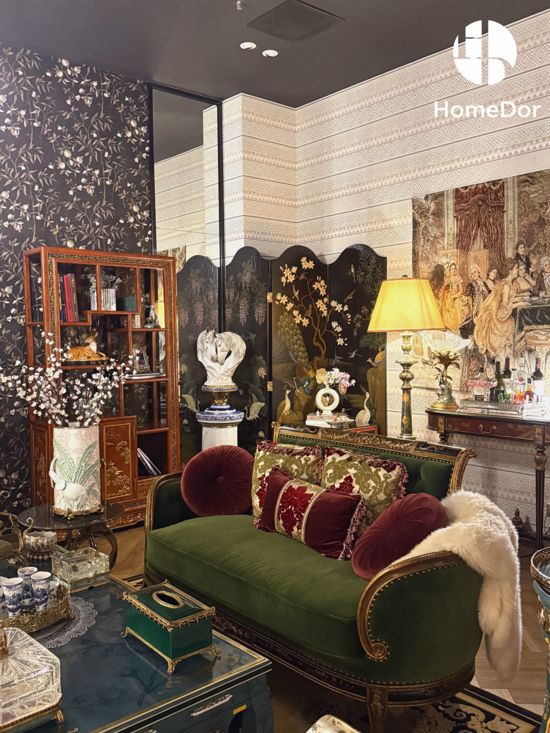هومدور × إف إتش آند هوم | أريكة قماشية خضراء على الطراز الفرنسي العتيق