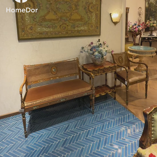 This charming double loveseat blends rustic warmth with vintage chic: its curved silhouette and delicate hand-painted accents bring old-world charm, while the woven rattan backrest adds breezy texture. The plush, soft seat cushion (upholstered in a neutral fabric) balances comfort with the piece’s refined aesthetic—perfect for adding a cozy, timeless touch to any space.With its graceful lines and subtle decorative details, this loveseat fits seamlessly into rustic cottages, classic living rooms, or sunlit reading nooks: it works as a welcoming entryway seat, a complement to a vintage coffee table, or a cozy spot for quiet conversations.