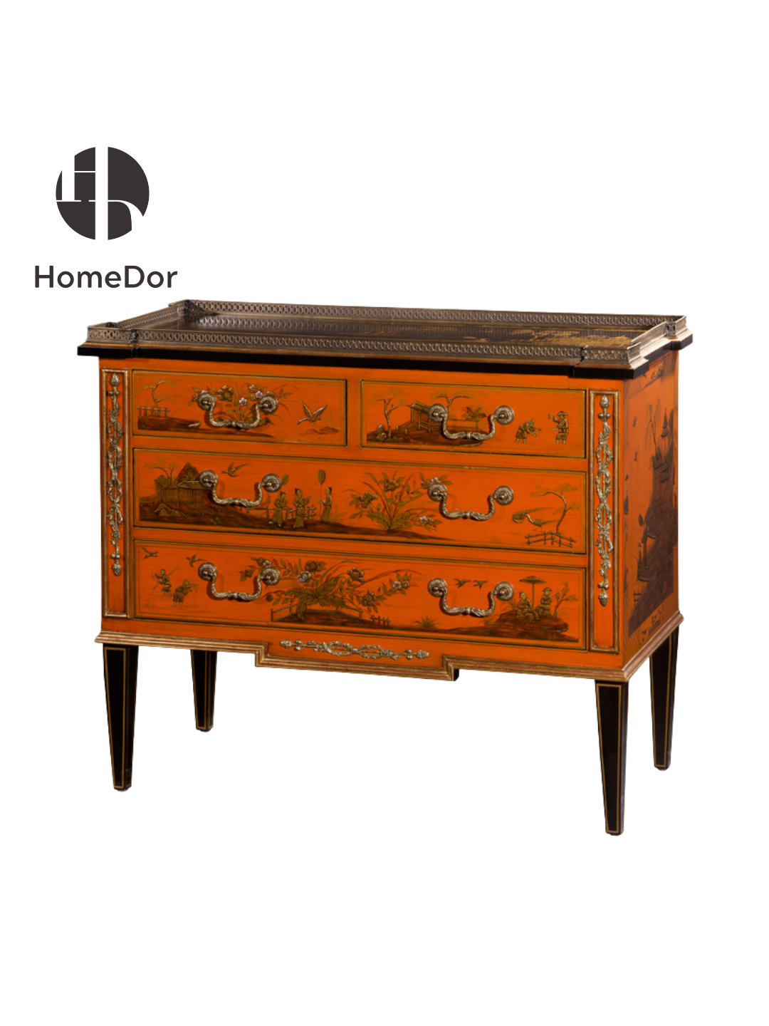 This console cabinet from HomeDor’s Gilded Orange Charm Series is a striking blend of Eastern artistry and Western luxury. Its vivid orange finish serves as a backdrop for hand-painted Chinese landscape motifs, featuring pavilions, winding rivers, and delicate foliage, all outlined with intricate gilded detailing. The curved silhouette and ornate gilded trim echo classic Rococo design, while the hand-rendered scenes infuse it with serene, timeless Eastern charm. Designed for both display and storage, it functions as an elegant focal point in entryways or living rooms, seamlessly bridging cultural aesthetics to elevate curated interiors.