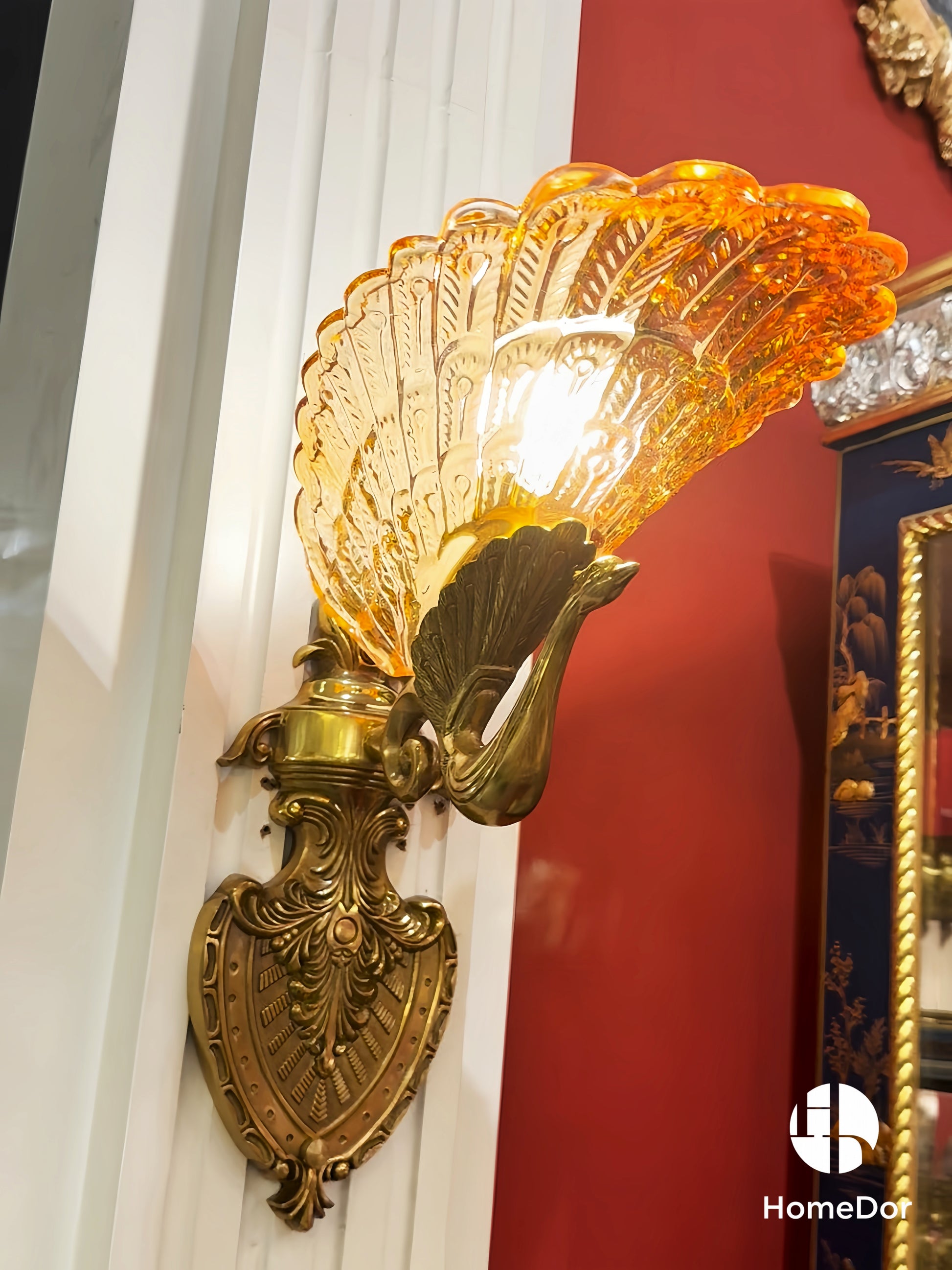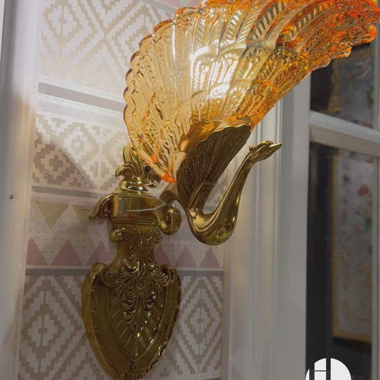 هذه الشمعدانات الجدارية تُحوّل بجعةً سماويةً إلى تحفة فنية عملية. صُنعت هذه القطعة ببراعة من قِبل FH&Home، وتتميز بتصميم أنيق من النحاس المذهب على شكل بجعة، برقبة مقوسة ورأس ملكي، يتدفق جسمها ليشكل ذيلًا دراميًا على شكل مروحة من زجاج العنبر المتدرج - كل ريشة محفورة بنقوش دقيقة تُحاكي الذهب المصهور. زجاج الذيل قزحي الألوان، يتراوح بين البرتقالي المحروق والذهبي العسلي.