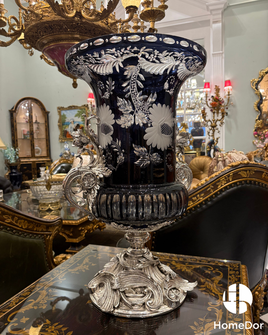 HomeDor Luxury Baroque Obsidian Blue Silver-Plated Brass Glass Decorative Urn Vase