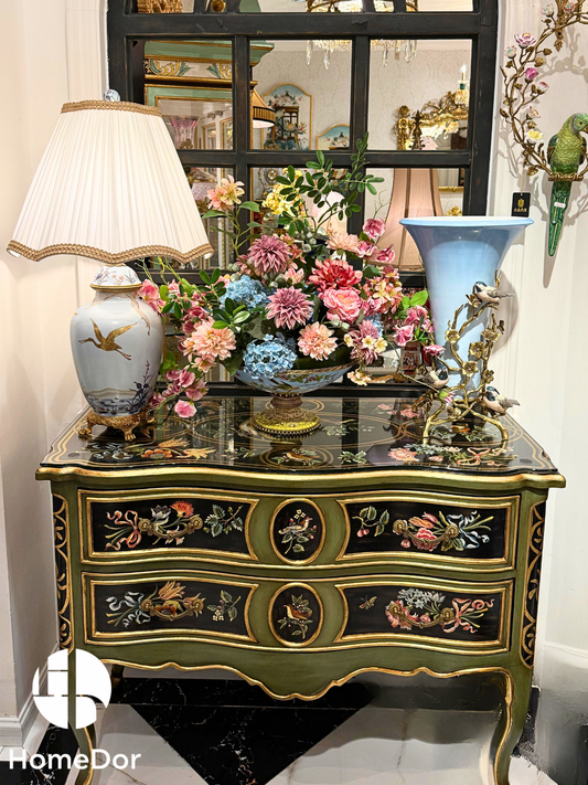 HomeDor Rococo Revival Bird & Floral 3-Drawer Console Chest Louis XV Commode