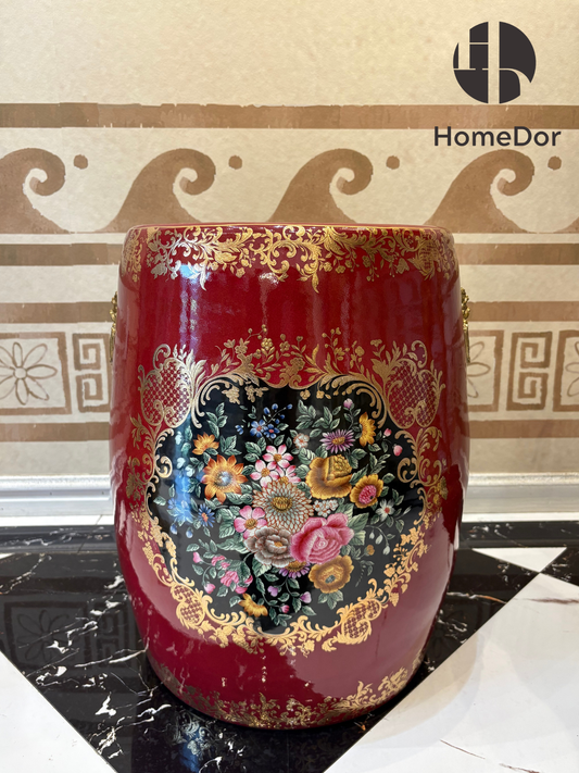 HomeDor Opulent Floral Bouquet Red Porcelain Drum Stool