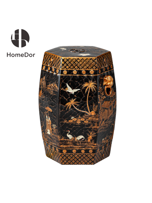 HomeDor Antique Lacquer Gilded Crane Motif Drum Stools