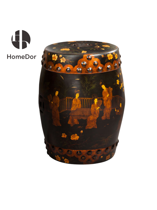 HomeDor Chinoiserie Black & Silver Courtly Ladies Scene Porcelain Stools