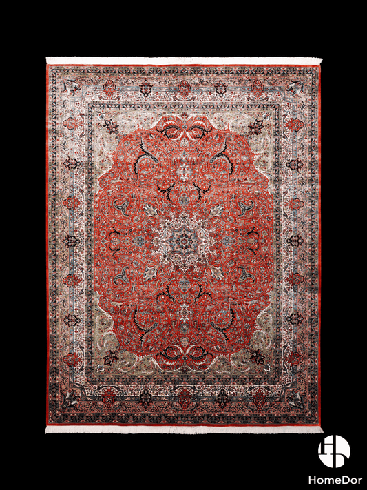 HomeDor Kashmir Handmade Mulberry Silk Red & Gold Medallion Rug 188cm × 272cm
