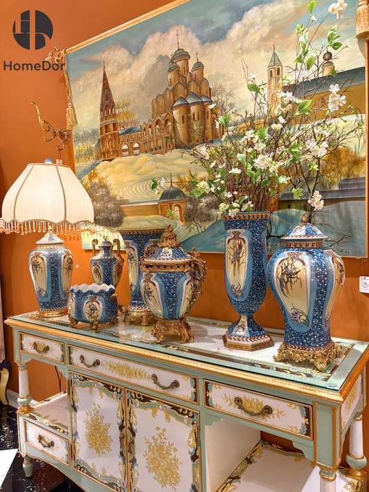 HomeDor Opulent Azure Palace Blue Avian Floral Decor Set