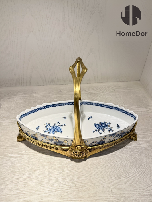 HomeDor Classic Triangular Porcelain Fruit Platter with Brass Handle