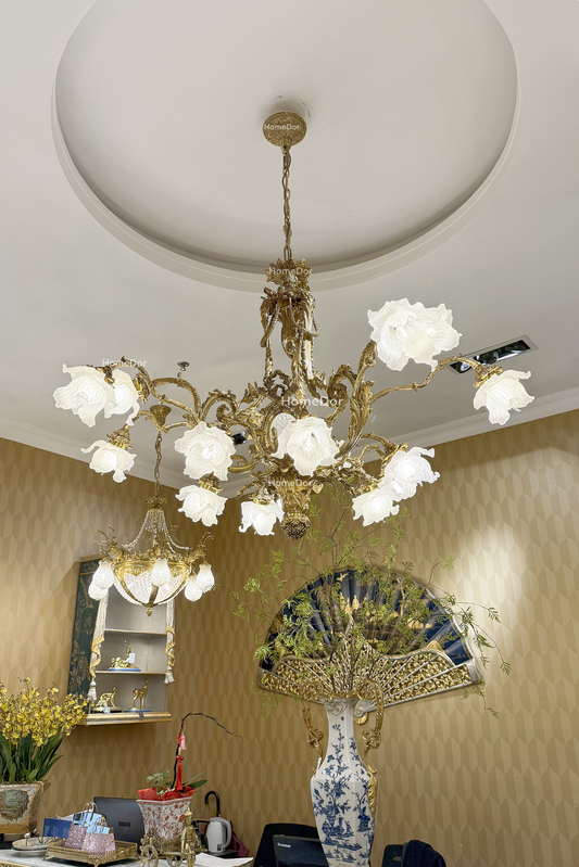 HomeDor × FH&Home | Lámpara de araña rococó de latón con pantallas florales de vidrio esmerilado