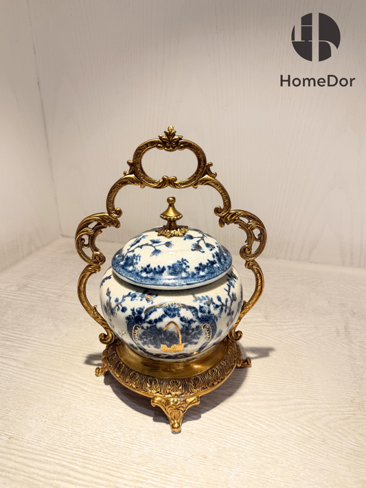 Exquisita urna de porcelana azul y blanca HomeDor con asas y tapa de latón