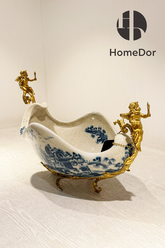 HomeDor × FH&Home | Exquisita bandeja de frutas de porcelana azul y blanca con asas de querubines