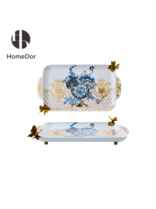 HomeDor Chinoiserie Blue and White Peony Gilded Decor Set II