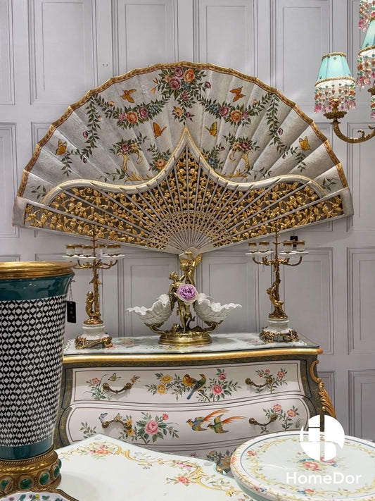 HomeDor Chinoiserie Luxury Silver Foil Floral Fan Wall Art