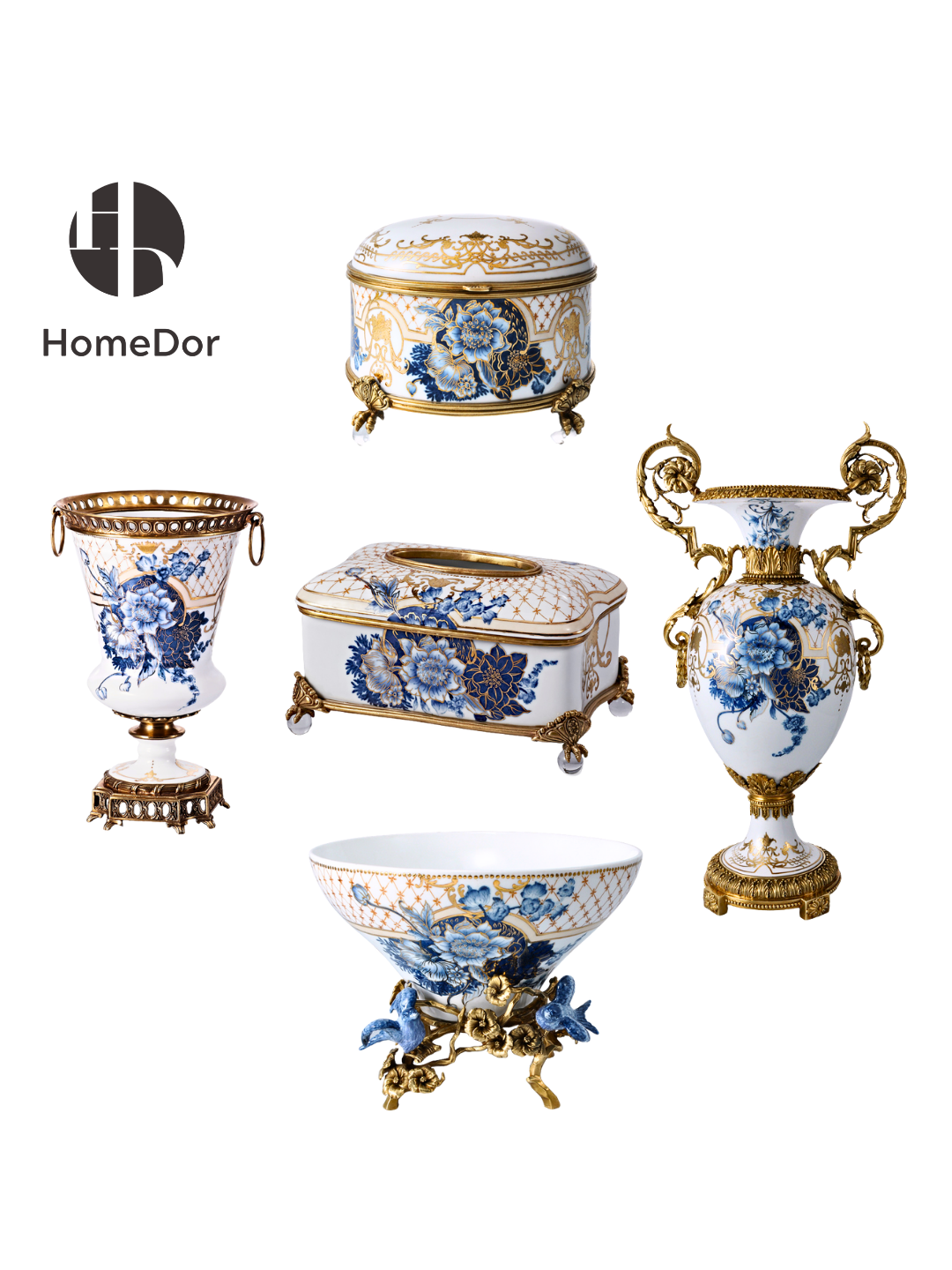 Este juego de decoración combina el encanto chinoiserie atemporal con opulentos detalles dorados: con delicados motivos de peonías azules y blancas (un símbolo de prosperidad en la cultura china) combinados con acentos dorados ornamentados, cada pieza (desde el joyero hasta el jarrón) combina el arte clásico de la porcelana con la artesanía metálica real. Perfecto para colocar en mesas de comedor, consolas de entrada o estantes de la sala de estar, infunde espacios con la elegancia de Oriente y Occidente, ideal para elevar la decoración cotidiana o agregar un toque lujoso a reuniones especiales.