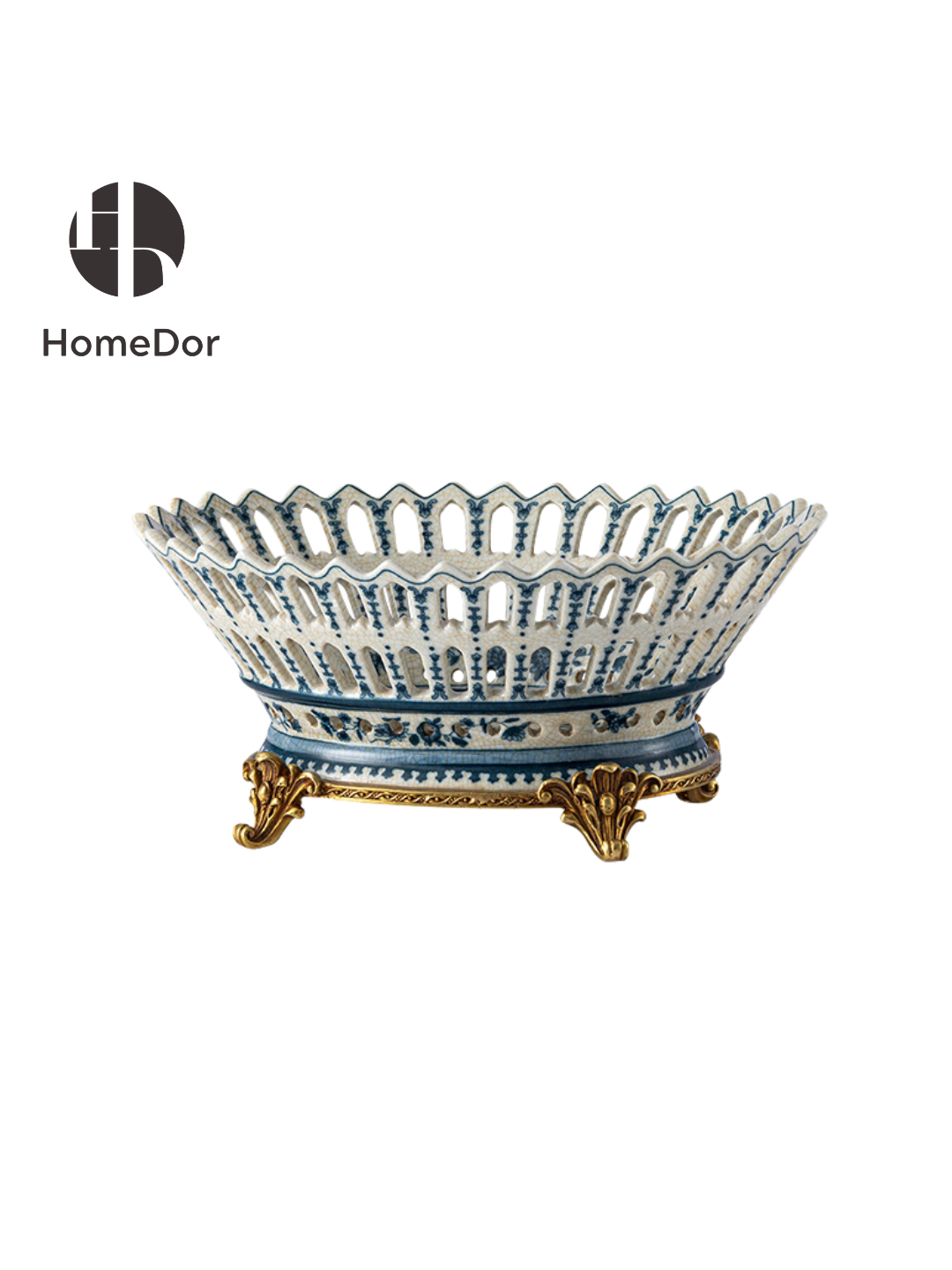 This striking centerpiece blends the timeless elegance of Chinese blue-and-white porcelain with intricate European craftsmanship. Its slanted, wide-open silhouette is defined by delicate hand-pierced openwork, creating light, airy patterns that catch the eye, while the hand-painted blue motifs echo classic chinoiserie design. The scalloped rim adds a soft, romantic finish, elevated by an ornate gilded metal base with scrolling details that lend a touch of vintage opulence.Perfect for displaying fresh fruit, botanicals, or decorative accents, it becomes a captivating focal point on dining tables, entry consoles, or living room coffee tables. Seamlessly integrating into transitional, eclectic, or globally inspired interiors, it offers a harmonious balance of East-West artistry and functional beauty.