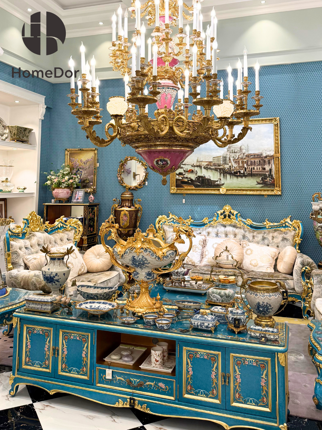 Combinando la elegancia aristocrática con una exquisita artesanía, el mueble de TV Blue Symphony es una pieza emblemática que realza tanto los interiores tradicionales como los de transición. Este mueble combina tonos azules imperiales con delicados motivos florales pintados a mano, evocando la majestuosidad romántica del diseño clásico europeo. Cada detalle, ya sea tallado o pintado, está cuidadosamente ejecutado para transformar este funcional mueble en una pieza central decorativa.