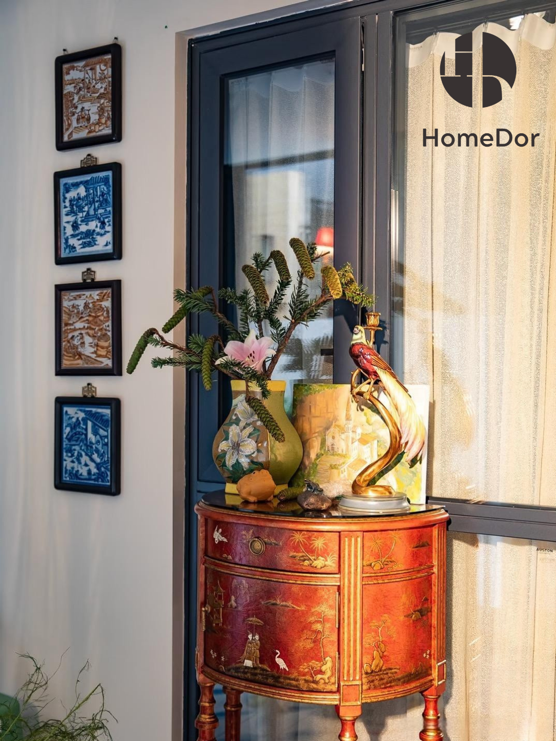 Gabinete lateral con acento de media luna de la serie Coral Red Chinoiserie de HomeDor