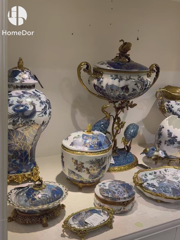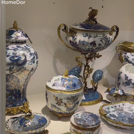 This Luxe Baroque Floral & Bird Hand-Painted Porcelain Decor Set embodies opulent vintage elegance: each piece features intricate hand-painted cobalt blue floral and bird motifs (peacocks, songbirds, lush foliage) on a crisp white porcelain base, elevated by ornate gilt brass accents—including sculpted handles, decorative trims, and detailed pedestal bases. The collection spans functional pieces (decorative canisters, tissue boxes, serving trays,vase) and decorative accents (lidded urns, centerpieces), merging baroque grandeur with artisanal detail to create a cohesive, luxe aesthetic for curated spaces.