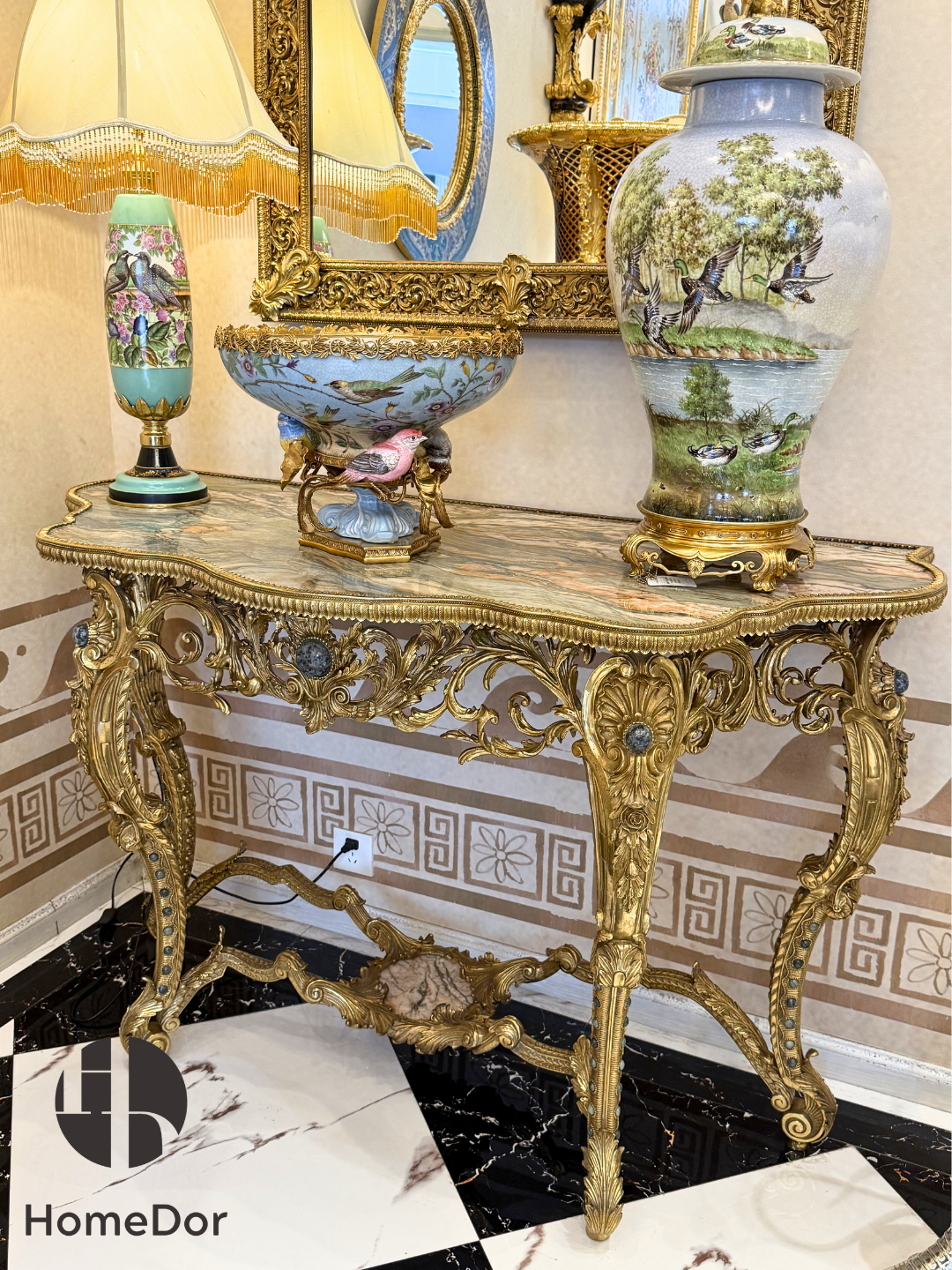 Esta lujosa consola con cubierta de mármol y marco de latón ornamentado es una incorporación excepcional y refinada a la colección HomeDor. Combina la elegancia atemporal del mármol veteado con el delicado y lujoso toque de los detalles del marco de latón ornamentado, creando una pieza que irradia grandeza y un encanto sofisticado.