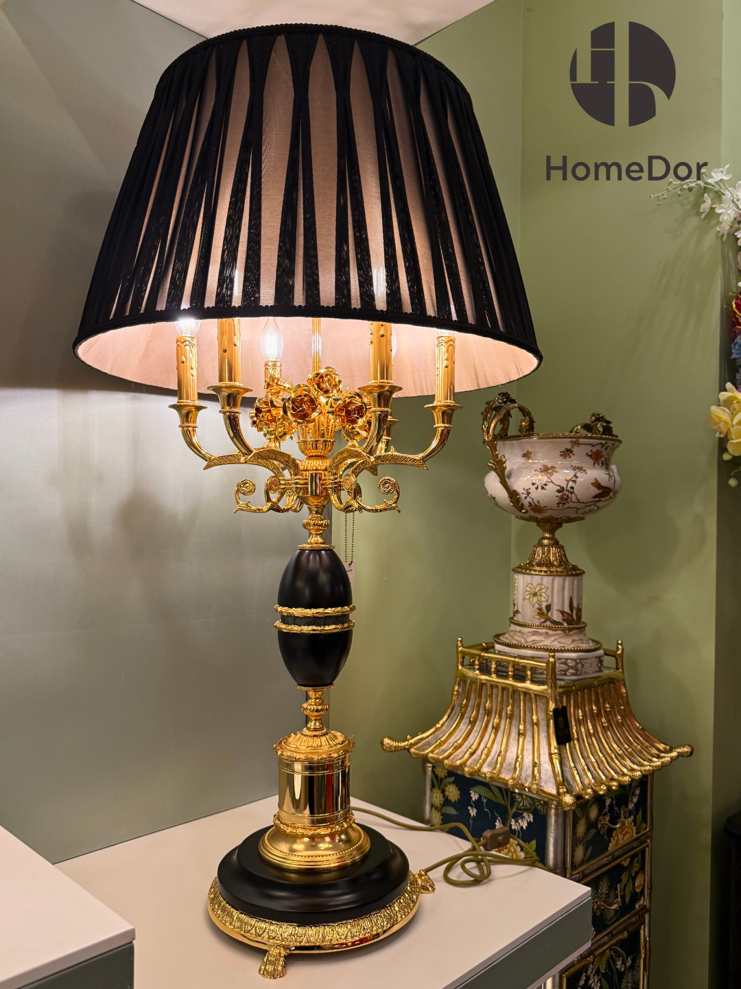 HomeDor × FH&Home | Lámpara de mesa de latón con pantalla plisada en negro y dorado de porcelana de lujo