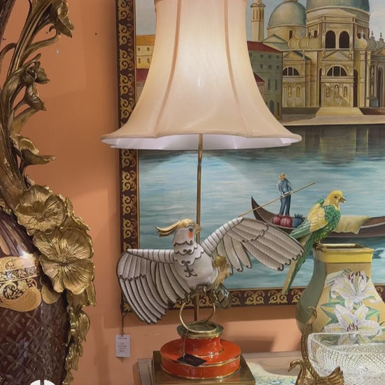 This table lamp features a detailed white cockatoo sculpture base (adorned with gilded accents, including the bird’s crest and decorative details) paired with a sleek, soft-beige fabric shade. The curved lamp arm follows the cockatoo’s wing line, merging playful artistry with functional lighting, while the red-and-gilded pedestal adds a pop of color and refined charm.