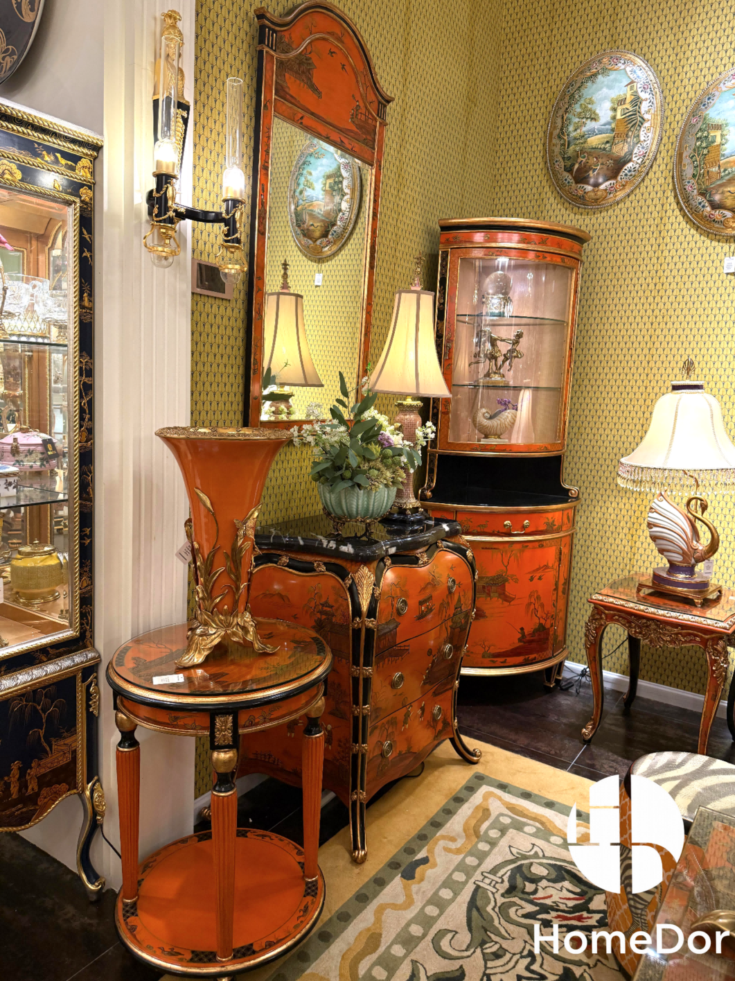 This elegant 2-tier accent table from HomeDor’s Gilded Orange Charm Series showcases a vibrant orange lacquered finish, adorned with hand-painted Chinese landscape motifs and accented with gilded detailing along its edges and legs. Its round silhouette, fluted legs, and contrasting black-and-gold trim blend Eastern artistry with neoclassical refinement, while the lower shelf offers practical display space. It serves as a sophisticated side table in formal living rooms, luxury bedrooms, or boutique hotel suites, adding a touch of timeless, cross-cultural elegance to any curated interior.
