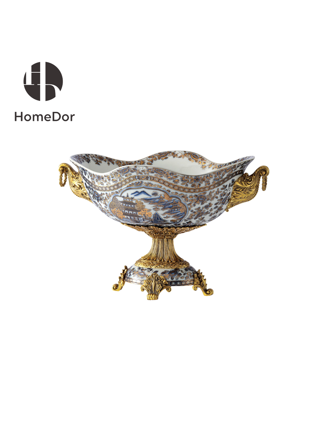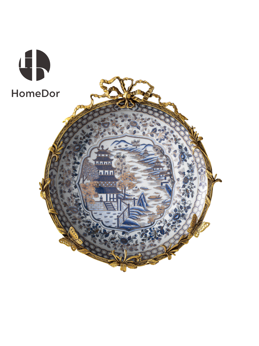 HomeDor Luxury Chinoiserie Pavilion Vista Porcelain Decor Set reimagines classic Chinoiserie with timeless elegance for modern luxury homes. Each piece is exquisitely hand-painted with intricate oriental pavilion and landscape motifs, rendered in a sophisticated palette of cobalt blue, crisp white and opulent gilded accents, and framed by ornate scrollwork mounts that artfully blend traditional Chinese artistic charm with French Rococo refinement. Boasting delicate hand-brush craftsmanship and refined decorative detailing, every piece functions as both a practical home accent and an exquisite decorative artwork, perfect for elevating entryway consoles, dining sideboards, living room mantels and more. Whether displayed as a complete ensemble or curated as individual statement pieces, this collection infuses any space with the quiet luxury of cross-cultural design, ideal for Chinoiserie enthusiasts and discerning home decor lovers alike.