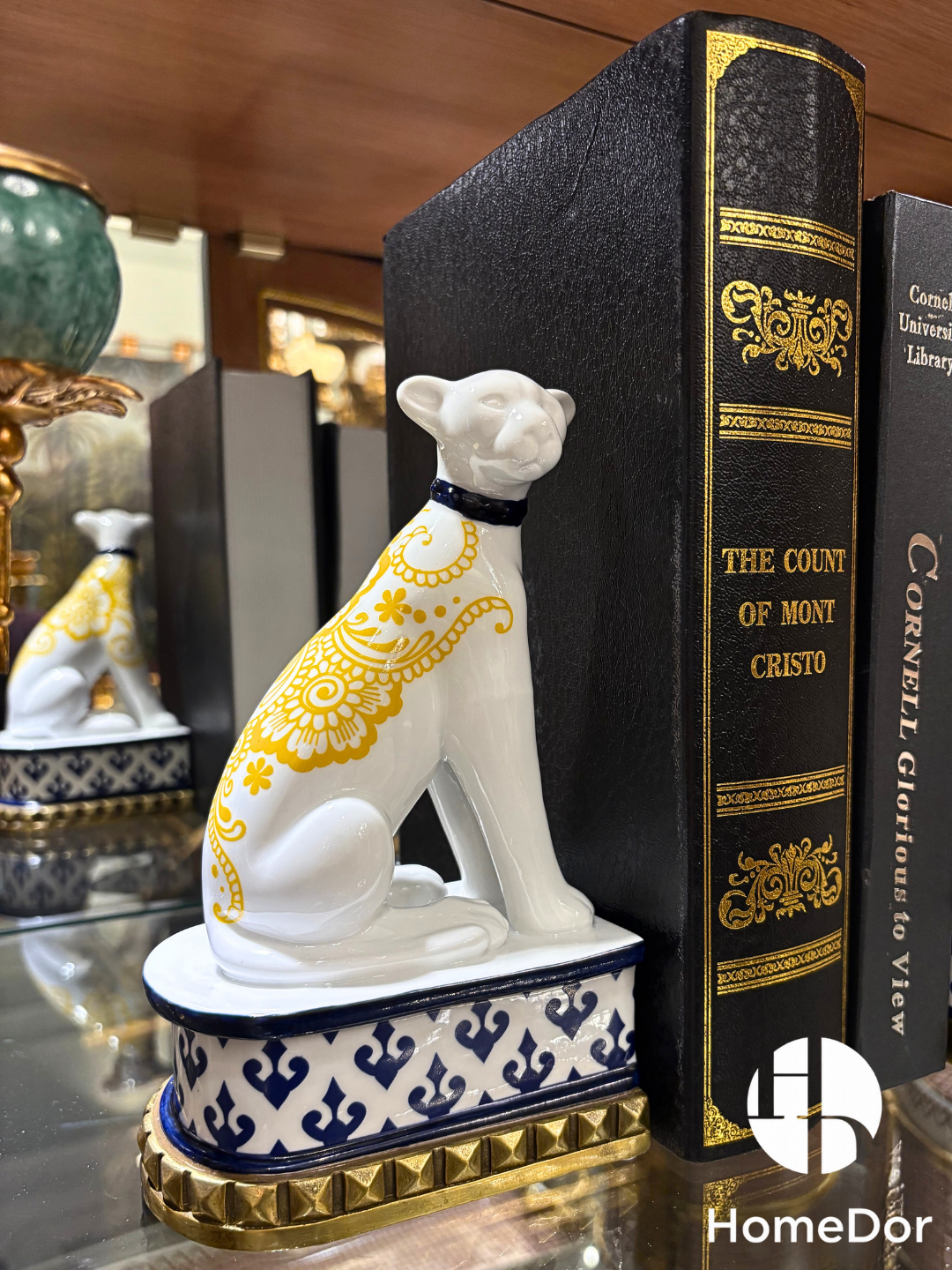 This striking pair of bookends features glossy white porcelain cheetahs adorned with hand-painted gilt floral filigree, seated on classic blue-and-white chinoiserie bases with gold-studded edges. Blending wild elegance with refined craftsmanship, they serve as both functional book supports and sophisticated decorative accents for home offices, libraries, or living spaces—ideal for wildlife lovers and luxury decor collectors alike.