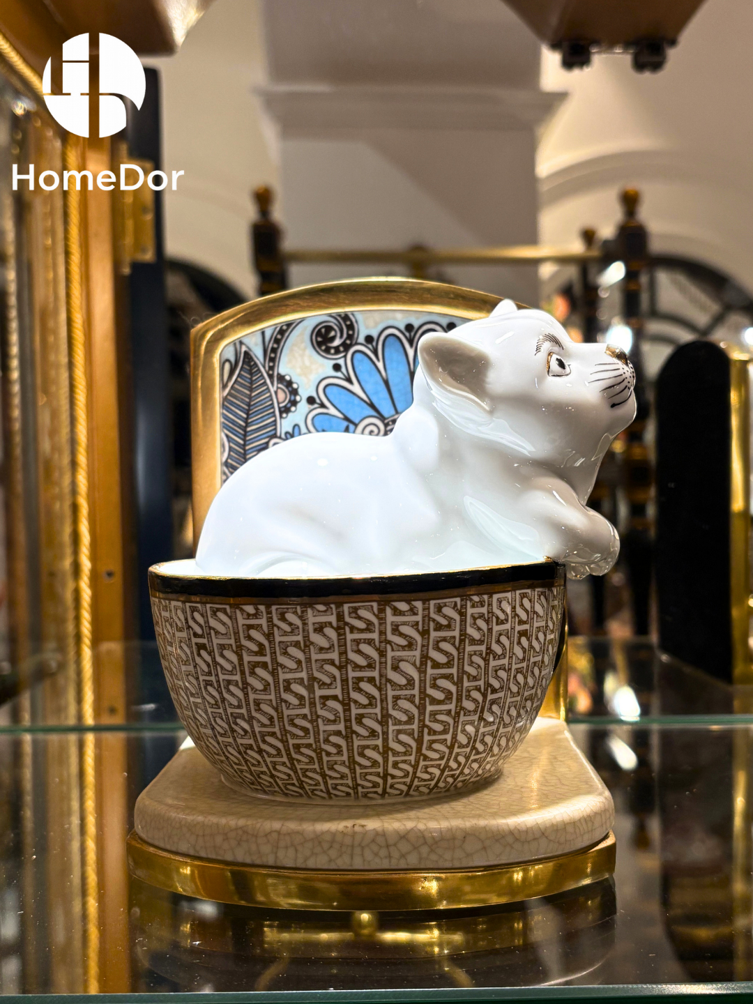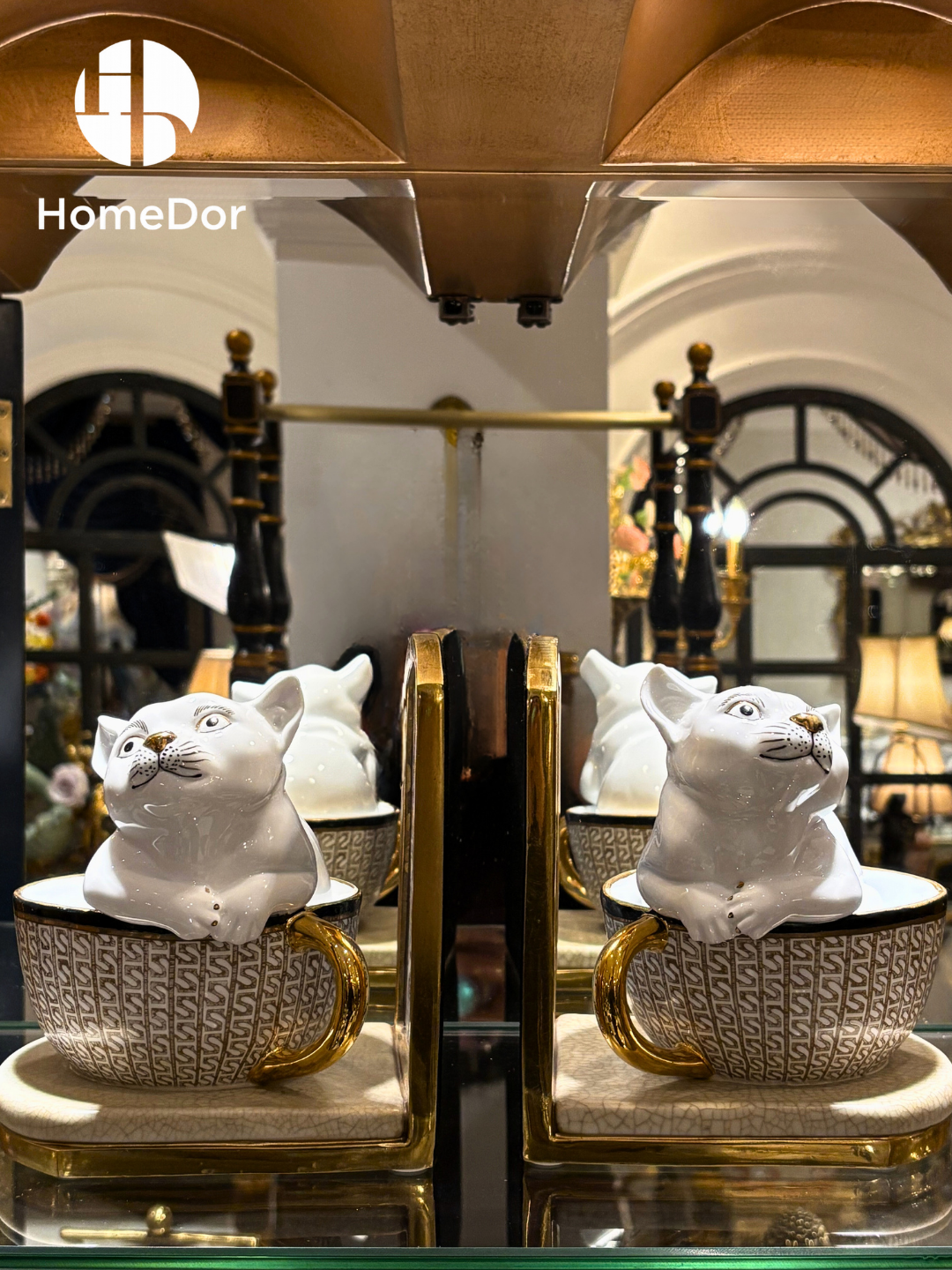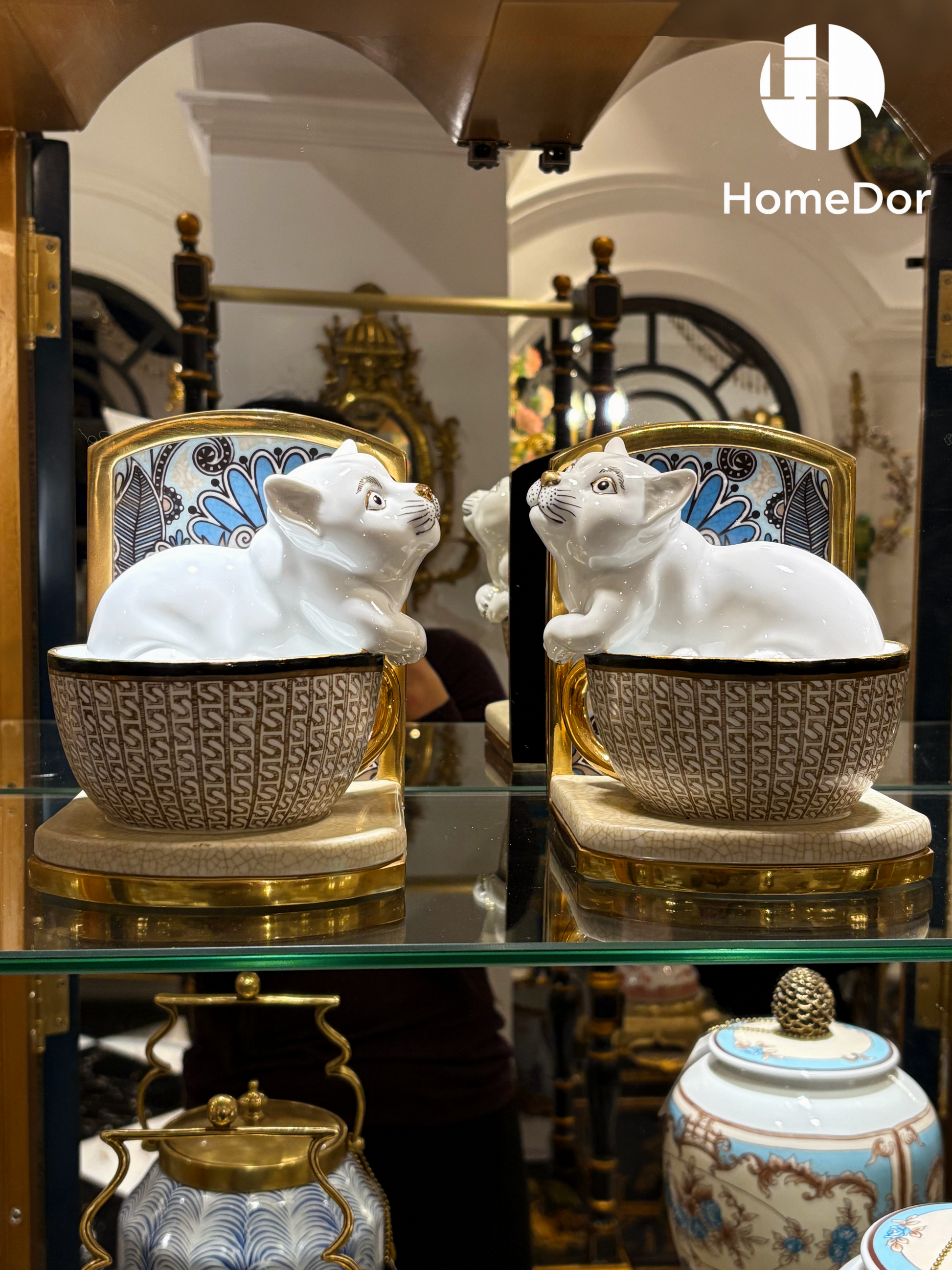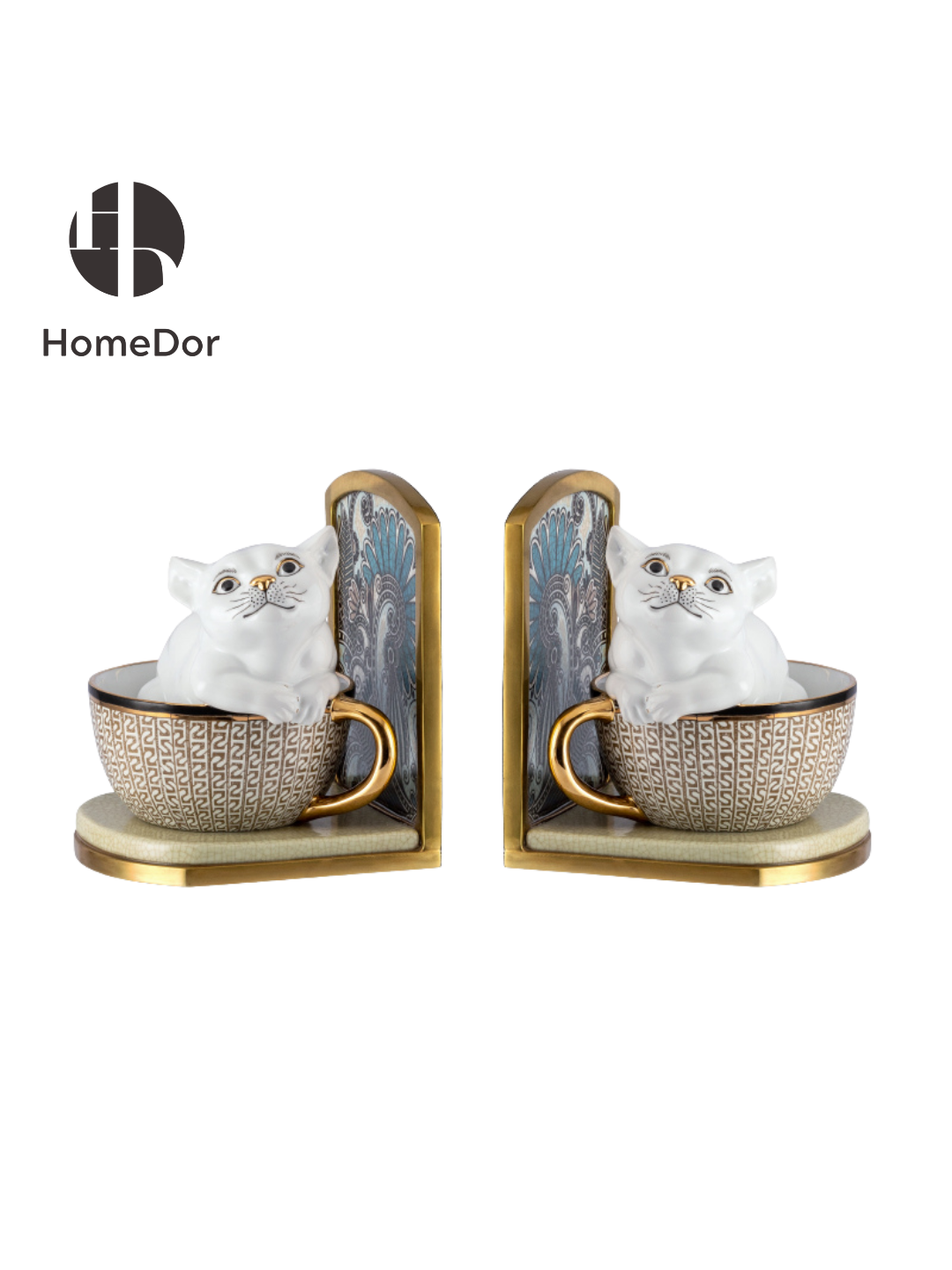 These charming bookends feature playful white porcelain kittens peeking out of gilded teacups, set against Art Deco-inspired backplates with intricate peacock feather motifs. The textured geometric pattern on the teacups and gold-trimmed bases blend whimsical charm with sophisticated craftsmanship, making them a delightful addition to any home office, kitchen nook, or cozy reading corner. Perfect for cat lovers, tea enthusiasts, and anyone who appreciates a touch of playful elegance in their decor.