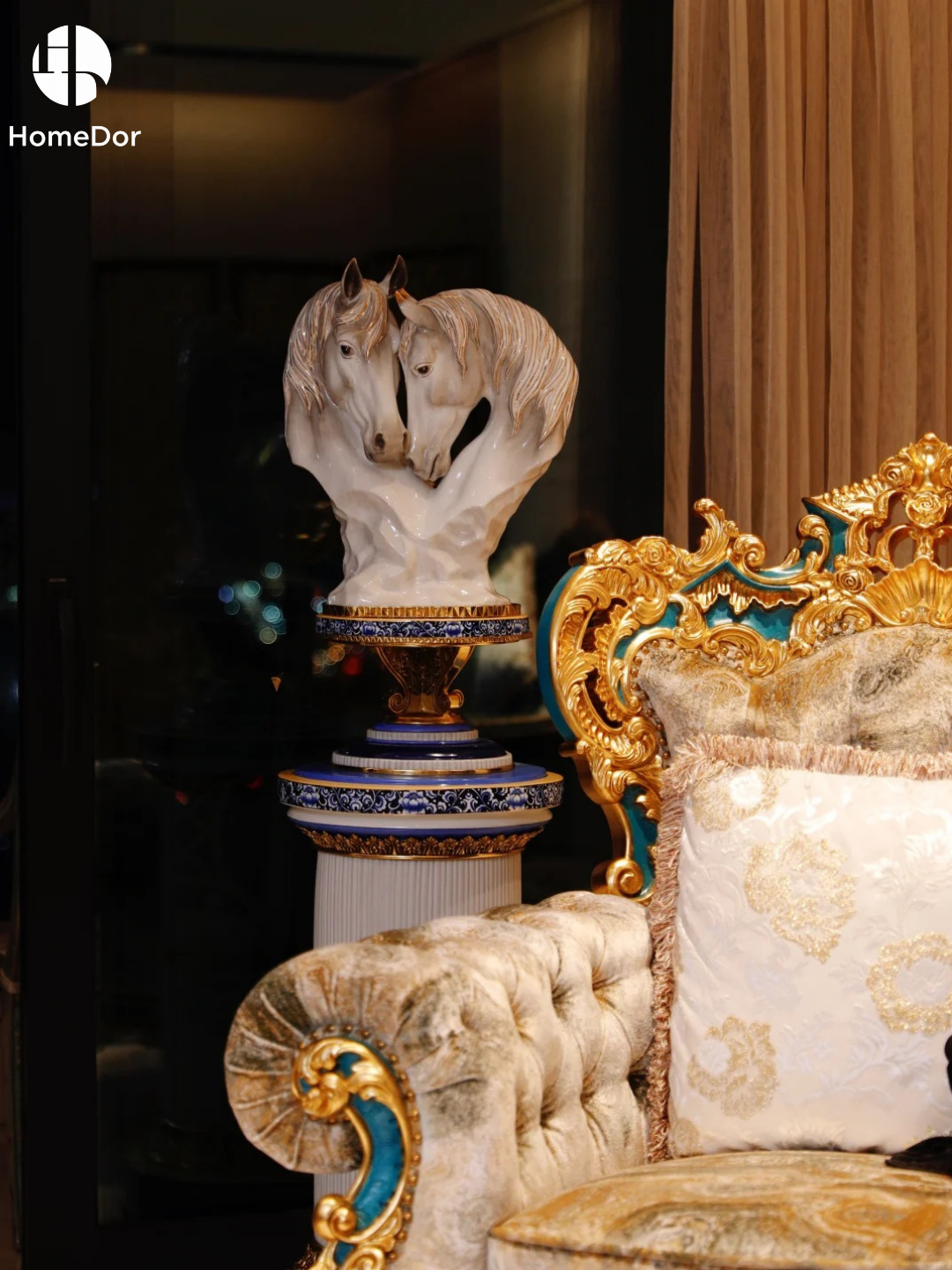 This collection of Elegant Porcelain Double Horse Head Sculptures with Decorative Pedestals from HomeDor, which embodies a harmonious fusion of artistry and refinement. Crafted with meticulous attention to detail, these sculptures feature exquisitely formed porcelain double horse heads atop ornately designed pedestals. They serve as captivating centerpieces, capable of elevating the aesthetic of any space with their grace and sophistication.