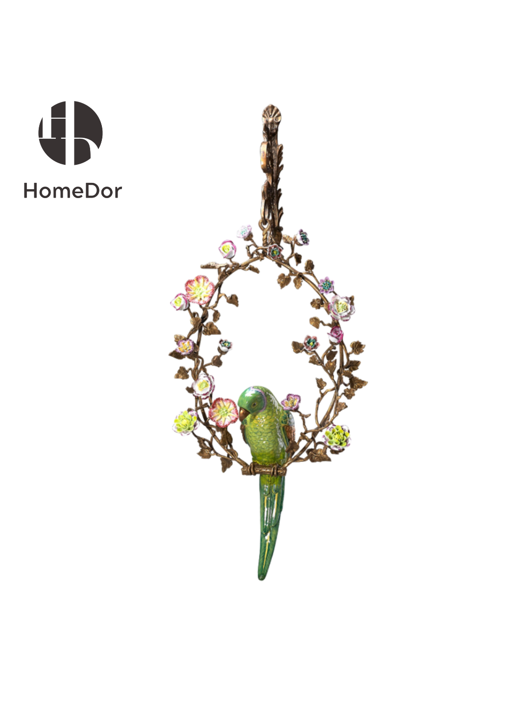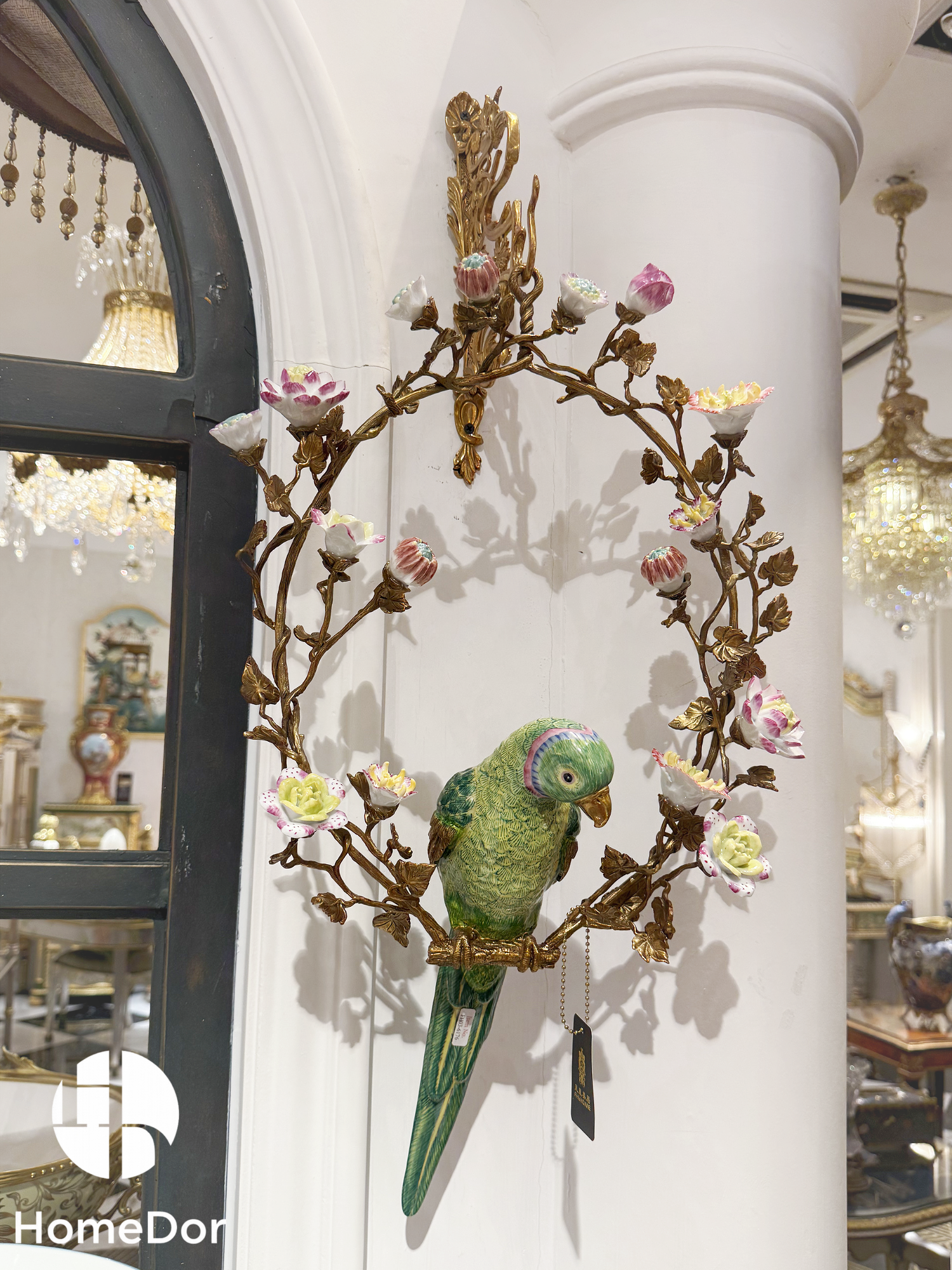 Decor&Gifts collection, this Artistic Hanging Wall Decor of Parrot Perched on Floral Hoop brings a touch of nature-inspired charm into refined interiors. The piece features a vibrantly detailed parrot resting gracefully on a floral hoop, symbolizing vitality and natural harmony. The combination of sculptural brass and high-temperature porcelain captures both movement and delicate beauty in one captivating composition.