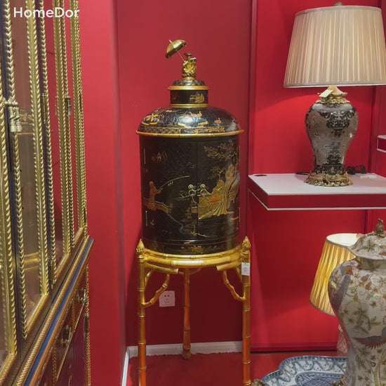 This chinoiserie-lacquered side cabinet with gold-painted figures and bamboo base is a captivating and refined addition to the HomeDor collection. It combines the classic allure of traditional Chinese lacquer craftsmanship with the delicate charm of gold- painted figure motifs and the natural elegance of a bamboo base, resulting in a piece that radiates timeless elegance and sophisticated artistry.
