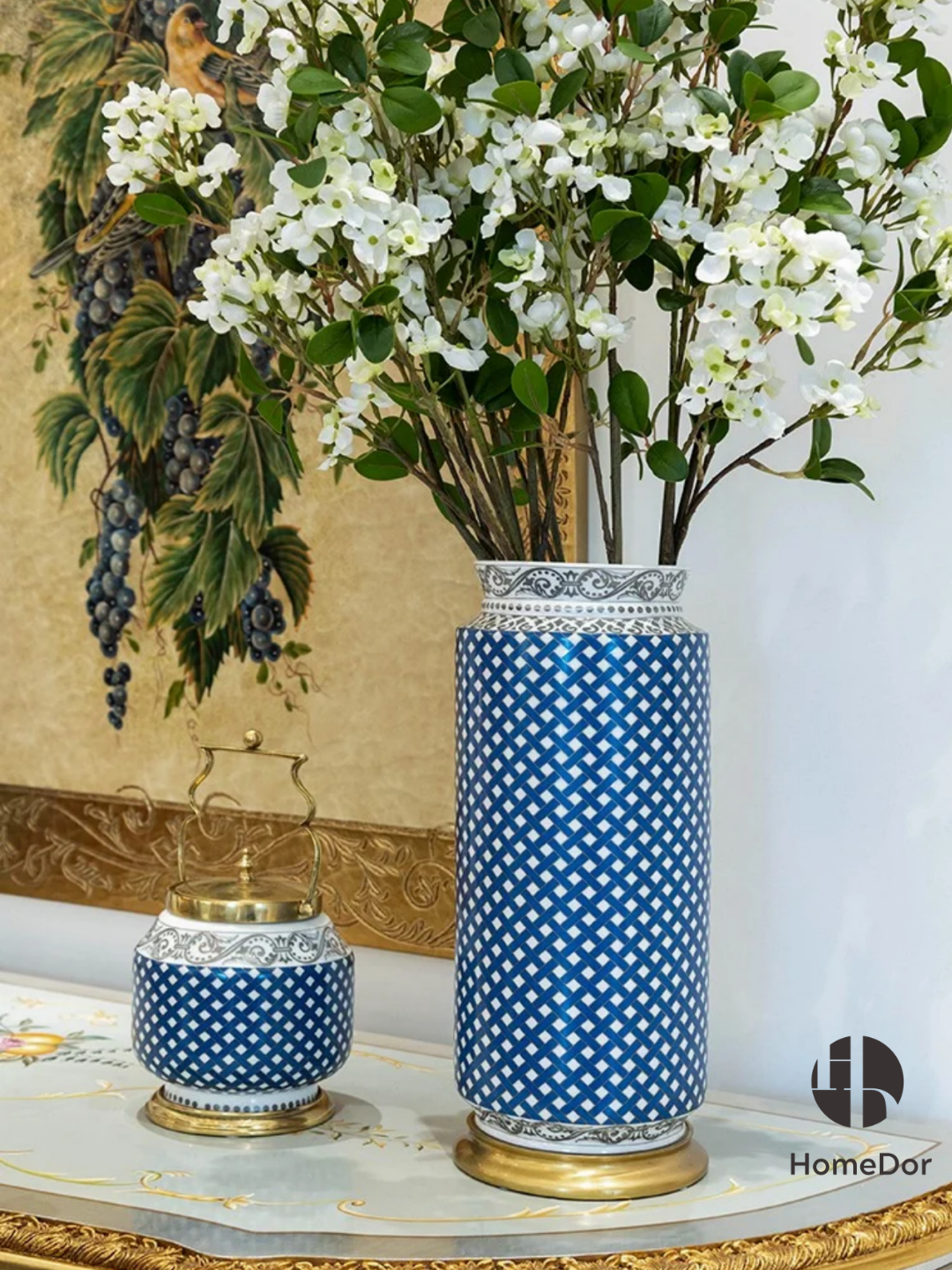 This Classic Blue & White Diamond Grid Decor Set (featuring a tissue box and handled canister) merges timeless pattern charm with luxurious detailing: its crisp blue-and-white diamond grid finish is elevated by ornate gilt accents—from the intricate trim on the tissue box to the polished brass handles and base of the canister. Blending vintage elegance with functional design, this set adds a refined, cohesive touch to living rooms, dining areas, or entryways, perfect for lovers of classic blue-and-white styling with a lavish twist.